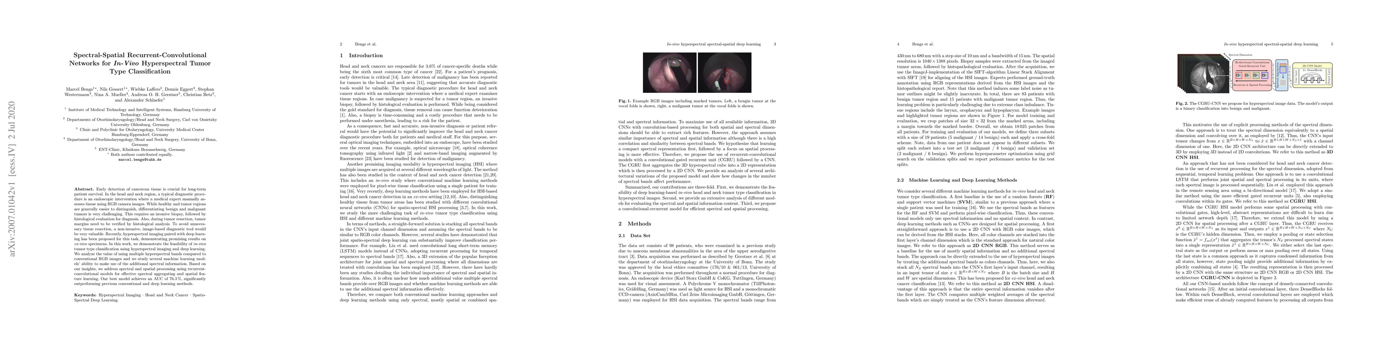 Early detection of cancerous tissue is crucial for long-term patient survival. In the head and neck region, a typical diagnostic procedure is an endoscopic intervention where a medical expert manually assesses tissue using RGB camera images. While healthy and tumor regions are generally easier to distinguish, differentiating benign and malignant tumors is very challenging. This requires an invasive biopsy, followed by histological evaluation for diagnosis. Also, during tumor resection, tumor margins need to be verified by histological analysis. To avoid unnecessary tissue resection, a non-invasive, image-based diagnostic tool would be very valuable. Recently, hyperspectral imaging paired with deep learning has been proposed for this task, demonstrating promising results on ex-vivo specimens. In this work, we demonstrate the feasibility of in-vivo tumor type classification using hyperspectral imaging and deep learning. We analyze the value of using multiple hyperspectral bands compared to conventional RGB images and we study several machine learning models' ability to make use of the additional spectral information. Based on our insights, we address spectral and spatial processing using recurrent-convolutional models for effective spectral aggregating and spatial feature learning. Our best model achieves an AUC of 76.3%, significantly outperforming previous conventional and deep learning methods.