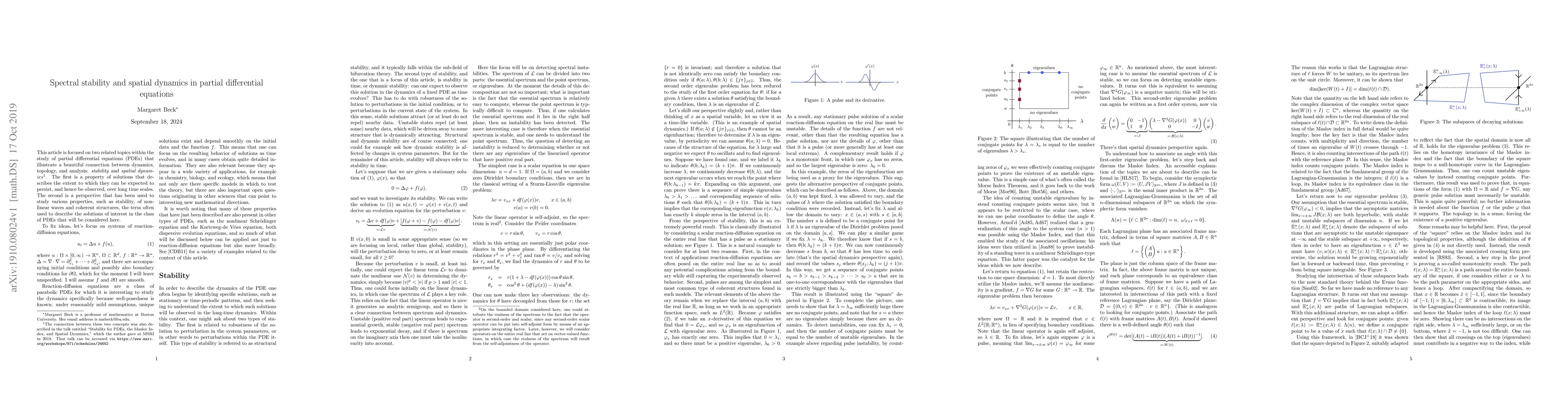 This article is focused on two related topics within the study of partial differential equations (PDEs) that illustrate a beautiful connection between dynamics, topology, and analysis: stability and spatial dynamics. The first is a property of solutions that describes the extent to which they can be expected to persist, and hence be observed, over long time scales. The second is a perspective that has been used to study various properties, such as stability, of nonlinear waves and coherent structures, the term often used to describe the solutions of interest in the class of PDEs that will be considered here.