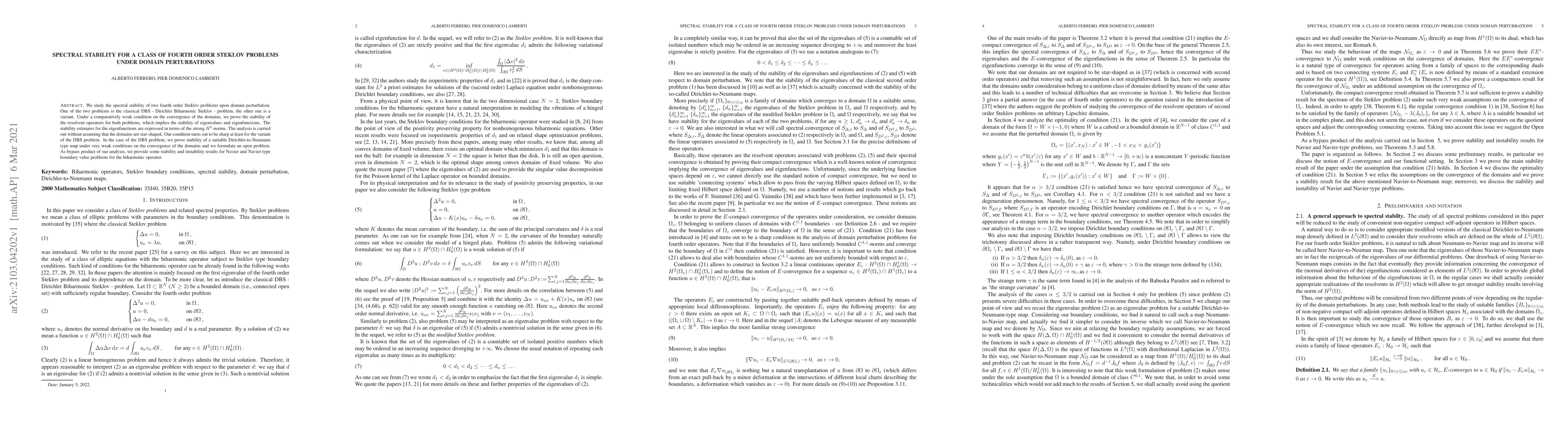 This paper investigates the spectral stability of two fourth-order Steklov problems—the classical DBS problem and a variant—under domain perturbations. It proves the stability of resolvent operators and eigenvalues, with stability estimates expressed in terms of $H^2$-norms, without requiring star-shaped domains.