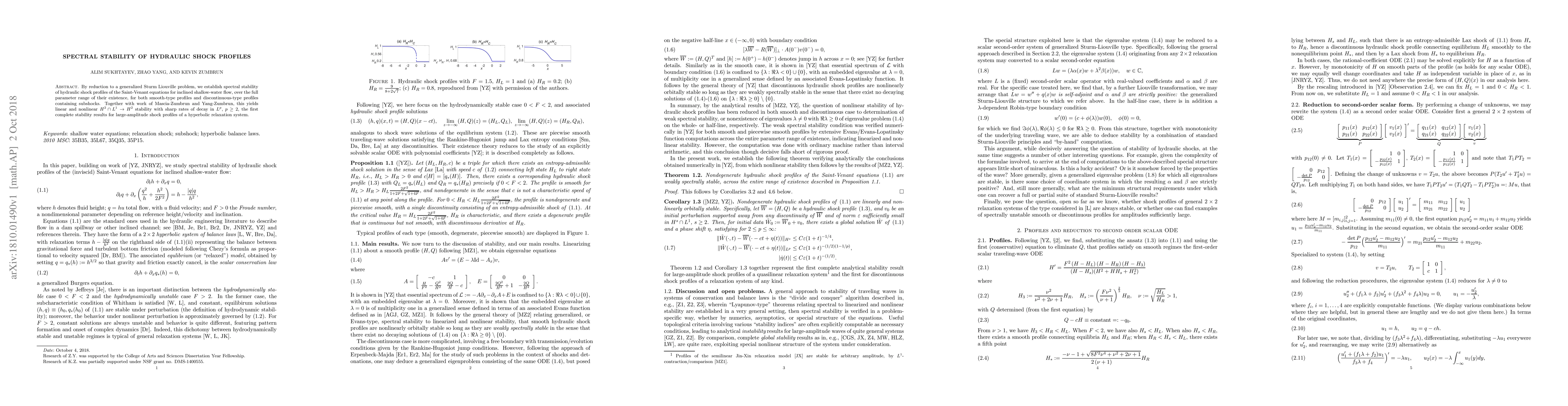 This paper establishes spectral stability for hydraulic shock profiles in inclined shallow-water flow governed by the Saint-Venant equations, covering both smooth and discontinuous profiles. It provides complete stability results for large-amplitude shock profiles, achieving linear and nonlinear stability with sharp decay rates.