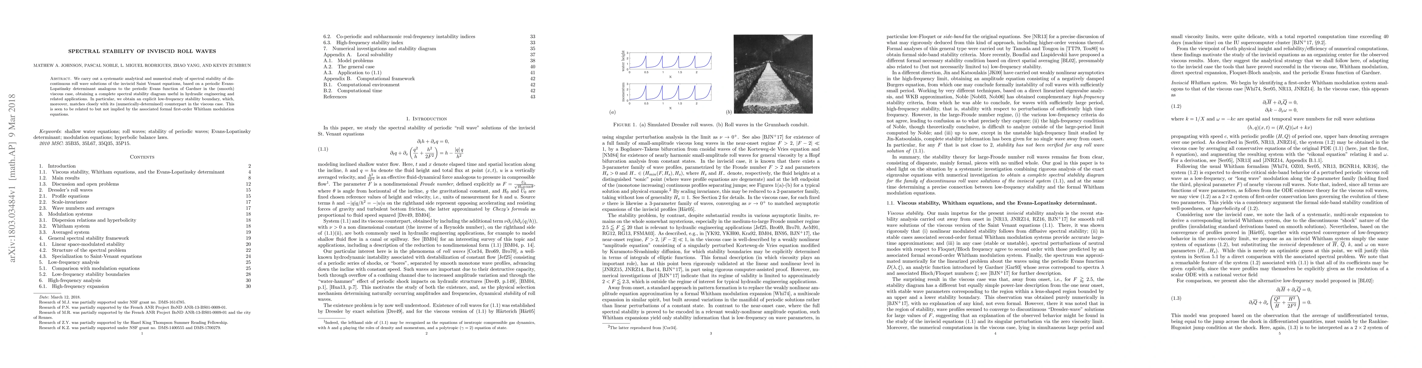 This paper investigates the spectral stability of inviscid roll waves using analytical and numerical methods, establishing a complete stability diagram and an explicit low-frequency stability boundary that closely matches the viscous case, providing valuable insights for hydraulic engineering.