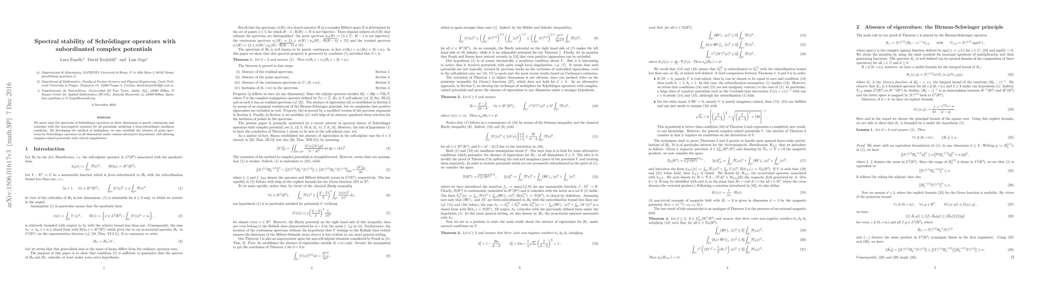We prove that the spectrum of Schroedinger operators in three dimensions is purely continuous and coincides with the non-negative semiaxis for all potentials satisfying a form-subordinate smallness condition. By developing the method of multipliers, we also establish the absence of point spectrum for Schroedinger operators in all dimensions under various alternative hypotheses, still allowing complex-valued potentials with critical singularities.