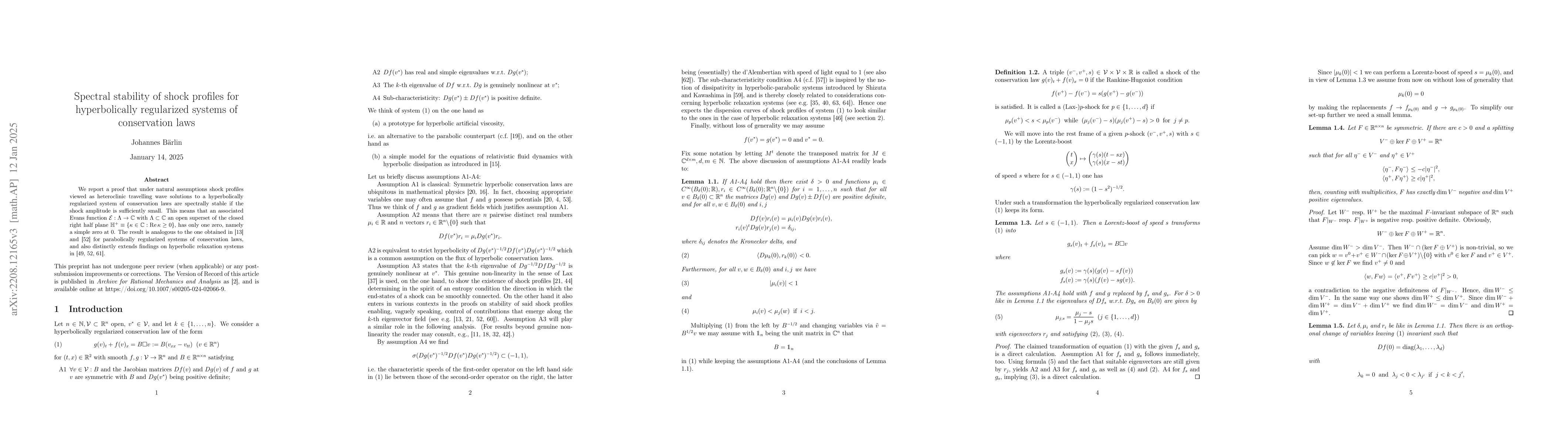 We report a proof that under natural assumptions shock profiles viewed as heteroclinic travelling wave solutions to a hyperbolically regularized system of conservation laws are spectrally stable, if the shock amplitude is sufficiently small. This means that an associated Evans function $\mathcal{E}:\Lambda\rightarrow\mathbb{C}$ with $\Lambda\subset\mathbb{C}$ an open superset of the closed right half plane $\mathbb{H}^+\equiv\{\kappa\in\mathbb{C}:\text{Re}\,\kappa \geq 0\}$, has only one zero, namely a simple zero at $0$. The result is analogous to the one obtained in [FS02] and [PZ04] for parabolically regularized systems of conservation laws, and also distinctly extends findings on hyperbolic relaxation systems in [PZ04], [MZ09], [Ued09] .