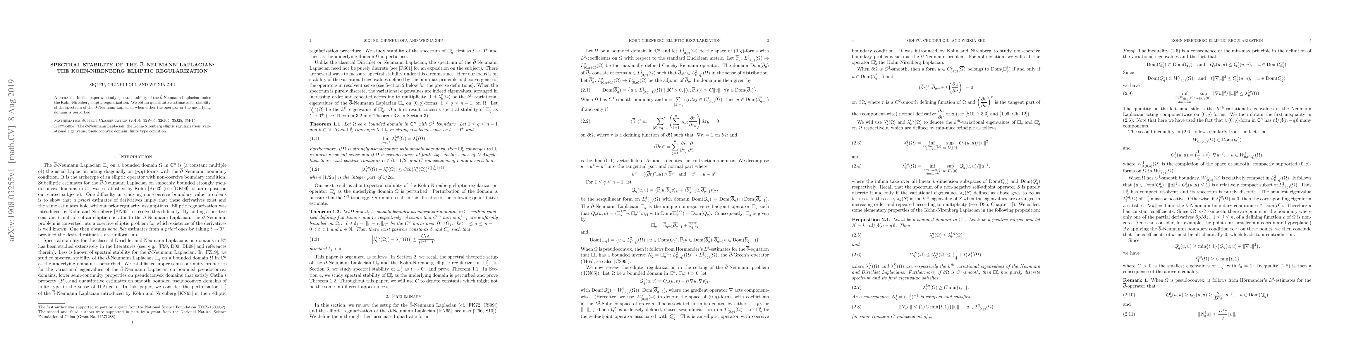 This paper investigates the spectral stability of the $\bar\partial$-Neumann Laplacian under Kohn-Nirenberg elliptic regularization, providing quantitative estimates for the stability of its spectrum under perturbations of the operator or the domain.