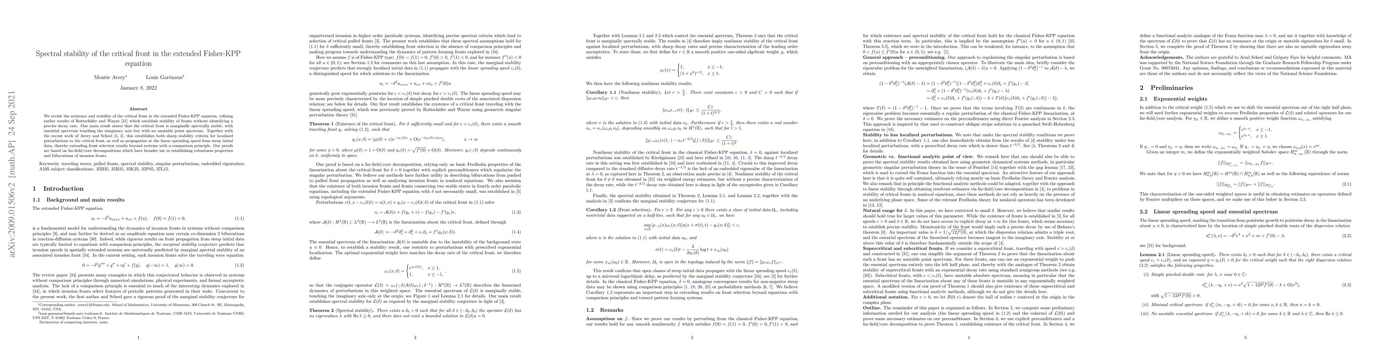 This paper refines the stability analysis of the critical front in the extended Fisher-KPP equation, confirming its marginal spectral stability without unstable eigenvalues. The study builds on previous work, establishing nonlinear stability with a sharp $t^{-3/2}$ decay rate.