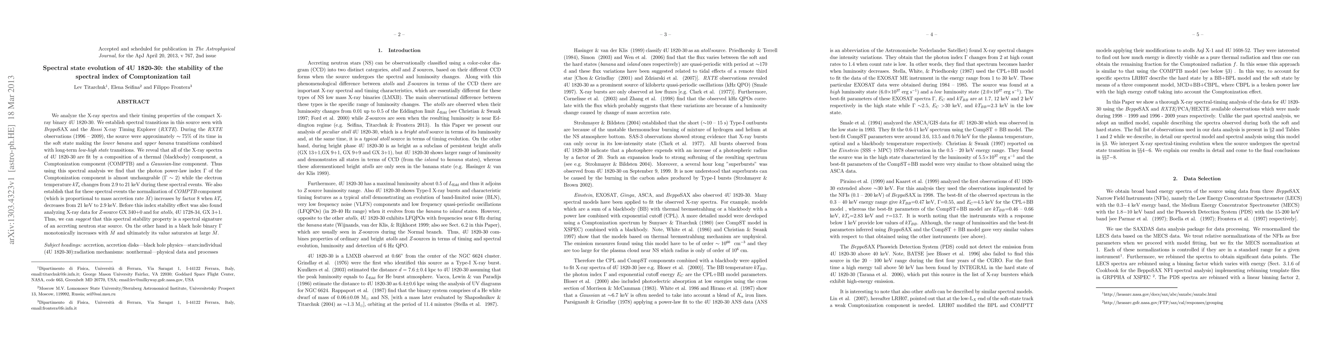 This paper investigates the spectral state evolution of the X-ray binary 4U~1820-30, revealing that the photon power-law index of the Comptonization tail remains stable (Gamma~2) despite variations in electron temperature. This spectral stability suggests a unique signature for accreting neutron star sources.
