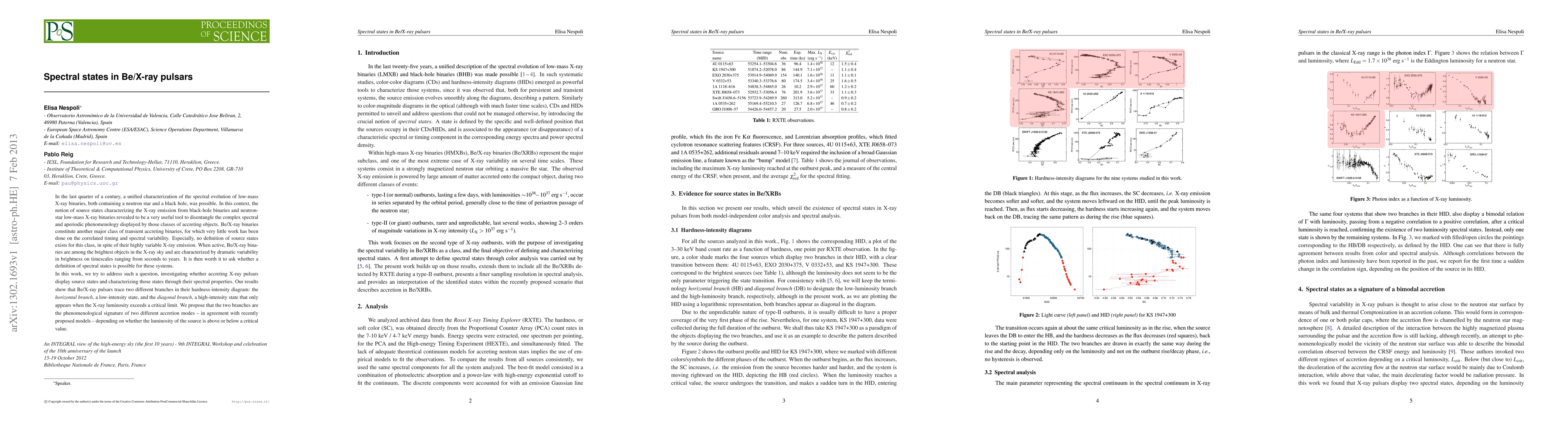 In the last quarter of a century, a unified characterization of the spectral evolution of low-mass X-ray binaries, both containing a neutron star and a black hole, was possible. In this context, the notion of source states characterizing the X-ray emission from black-hole binaries and neutron-star low-mass X-ray binaries revealed to be a very useful tool to disentangle the complex spectral and aperiodic phenomenology displayed by those classes of accreting objects. Be/X-ray binaries constitute another major class of transient accreting binaries, for which very little work has been done on the correlated timing and spectral variability. Especially, no definition of source states exists for this class, in spite of their highly variable X-ray emission. When active, Be/X-ray binaries are among the brightest objects in the X-ray sky and are characterized by dramatic variability in brightness on timescales ranging from seconds to years. It is then worth it to ask whether a definition of spectral states is possible for these systems. In this work, we try to address such a question, investigating whether accreting X-ray pulsars display source states and characterizing those states through their spectral properties. Our results show that Be/X-ray pulsars trace two different branches in their hardness-intensity diagram: the horizontal branch, a low-intensity state, and the diagonal branch, a high-intensity state that only appears when the X-ray luminosity exceeds a critical limit. We propose that the two branches are the phenomenological signature of two different accretion modes -- in agreement with recently proposed models -- depending on whether the luminosity of the source is above or below a critical value.