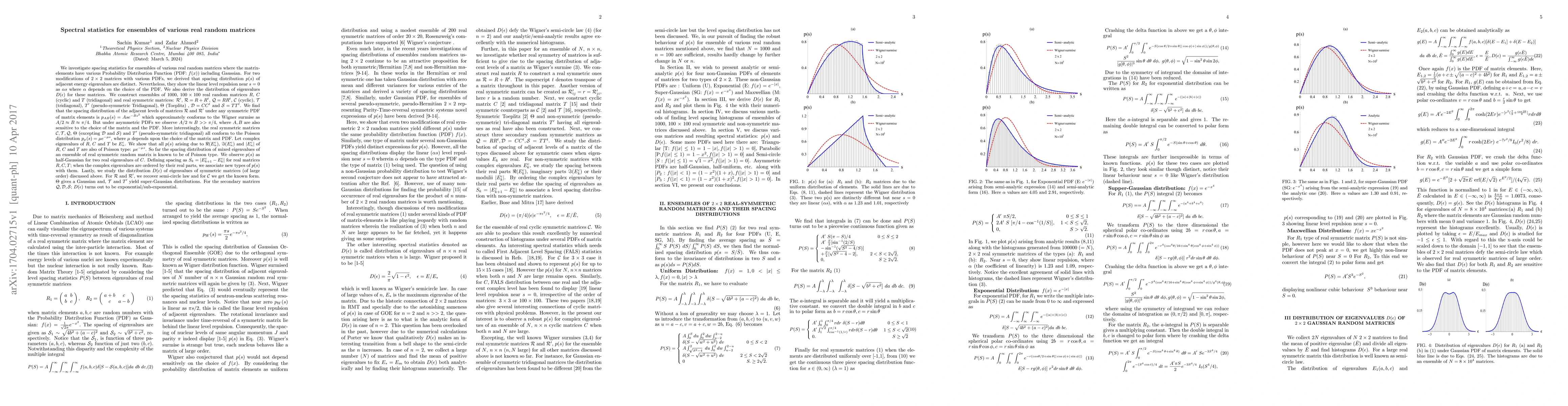 This paper investigates spacing statistics for ensembles of various real random matrices, finding that some conform to Poisson distribution, while others follow a Gaussian distribution or a specific half-Gaussian pattern, depending on the matrix type and probability distribution function.