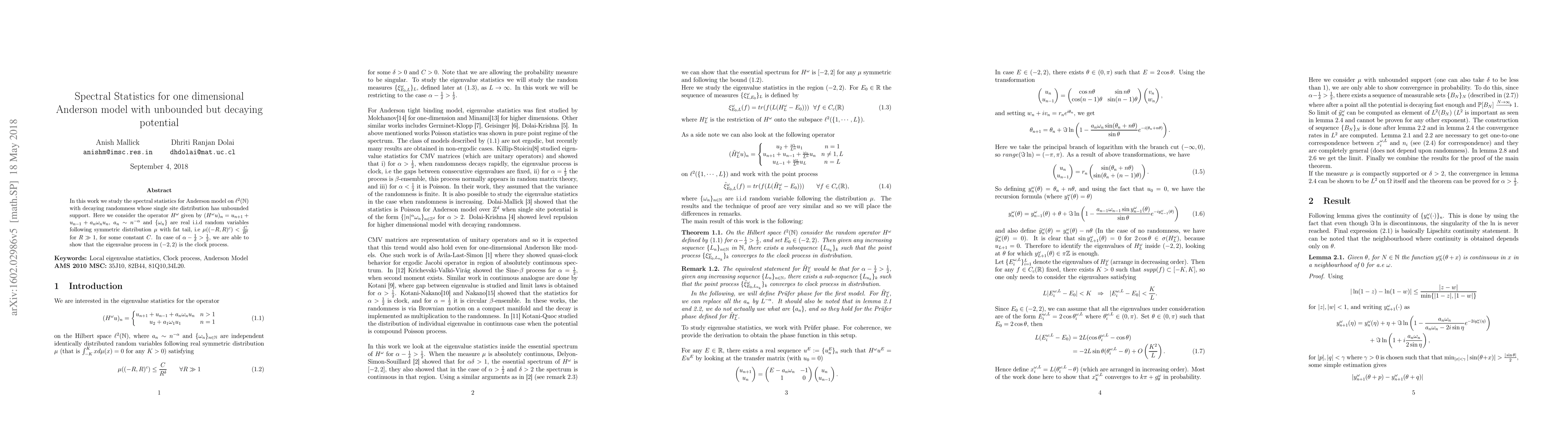 This paper investigates the spectral statistics of the one-dimensional Anderson model with unbounded but decaying potential, showing that under certain conditions, the eigenvalue process in the interval (-2,2) behaves as a clock process. The potential term follows a power law decay and the random variables exhibit heavy-tailed distributions.