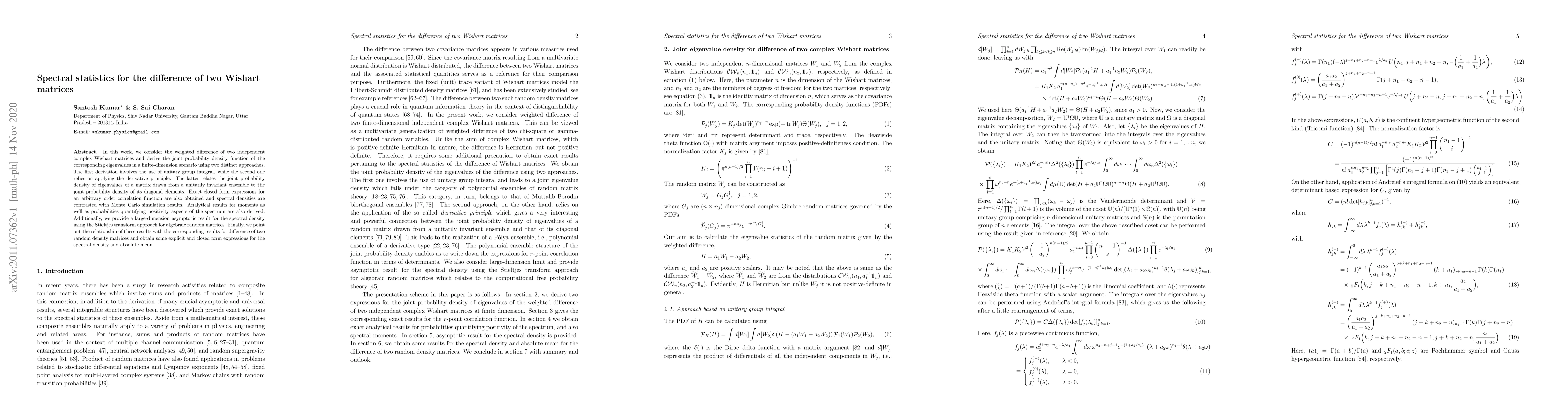 In this work, we consider the weighted difference of two independent complex Wishart matrices and derive the joint probability density function of the corresponding eigenvalues in a finite-dimension scenario using two distinct approaches. The first derivation involves the use of unitary group integral, while the second one relies on applying the derivative principle. The latter relates the joint probability density of eigenvalues of a matrix drawn from a unitarily invariant ensemble to the joint probability density of its diagonal elements. Exact closed form expressions for an arbitrary order correlation function are also obtained and spectral densities are contrasted with Monte Carlo simulation results. Analytical results for moments as well as probabilities quantifying positivity aspects of the spectrum are also derived. Additionally, we provide a large-dimension asymptotic result for the spectral density using the Stieltjes transform approach for algebraic random matrices. Finally, we point out the relationship of these results with the corresponding results for difference of two random density matrices and obtain some explicit and closed form expressions for the spectral density and absolute mean.