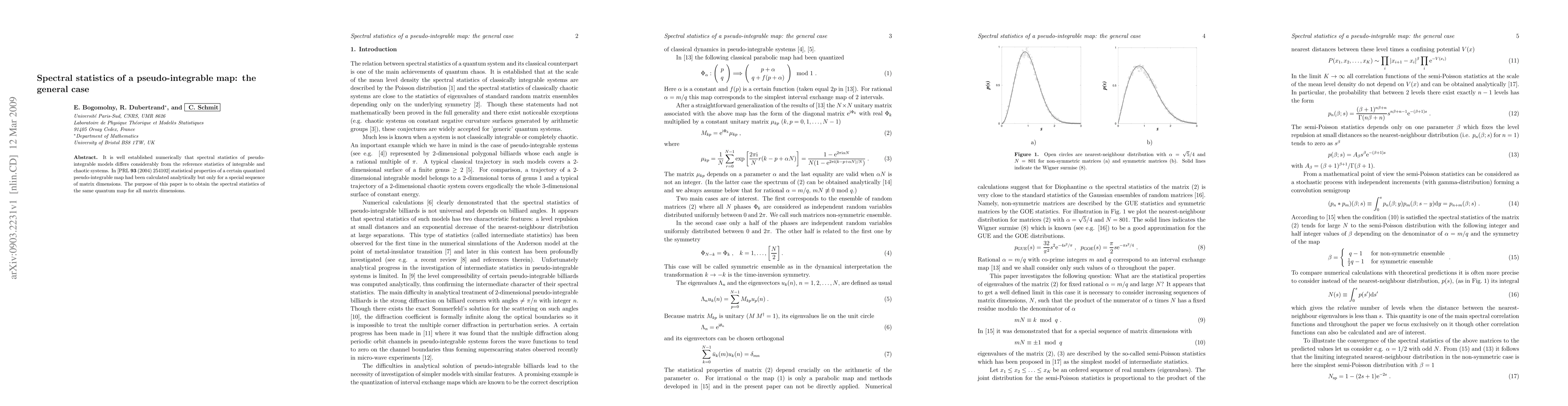 It is well established numerically that spectral statistics of pseudo-integrable models differs considerably from the reference statistics of integrable and chaotic systems. In [PRL,93 (2004) 254102] statistical properties of a certain quantized pseudo-integrable map had been calculated analytically but only for a special sequence of matrix dimensions. The purpose of this paper is to obtain the spectral statistics of the same quantum map for all matrix dimensions.