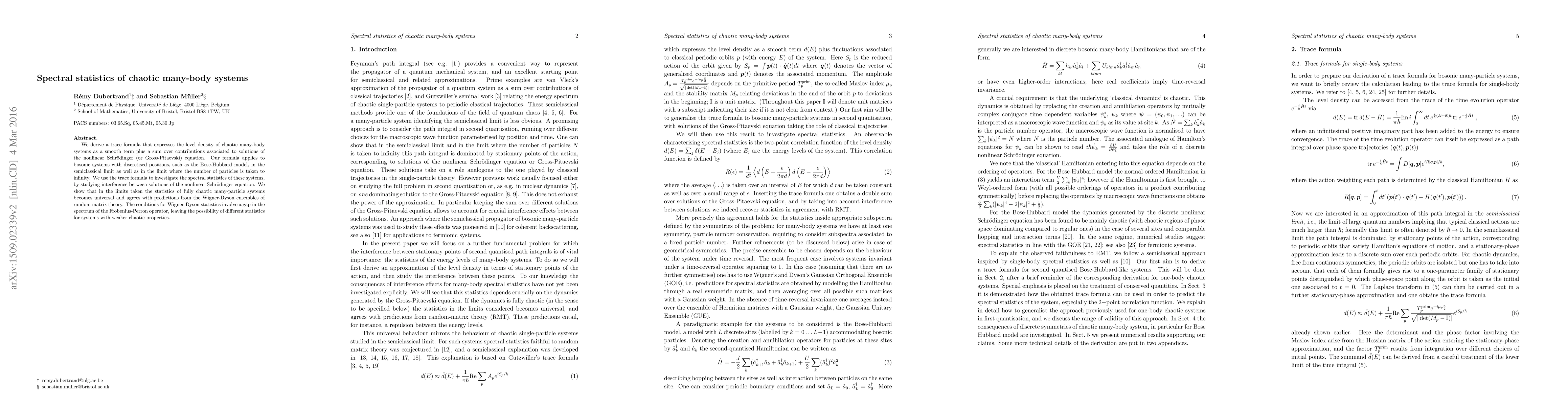 We derive a trace formula that expresses the level density of chaotic many-body systems as a smooth term plus a sum over contributions associated to solutions of the nonlinear Schr\"odinger (or Gross-Pitaevski) equation. Our formula applies to bosonic systems with discretised positions, such as the Bose-Hubbard model, in the semiclassical limit as well as in the limit where the number of particles is taken to infinity. We use the trace formula to investigate the spectral statistics of these systems, by studying interference between solutions of the nonlinear Schr\"odinger equation. We show that in the limits taken the statistics of fully chaotic many-particle systems becomes universal and agrees with predictions from the Wigner-Dyson ensembles of random matrix theory. The conditions for Wigner-Dyson statistics involve a gap in the spectrum of the Frobenius-Perron operator, leaving the possibility of different statistics for systems with weaker chaotic properties.