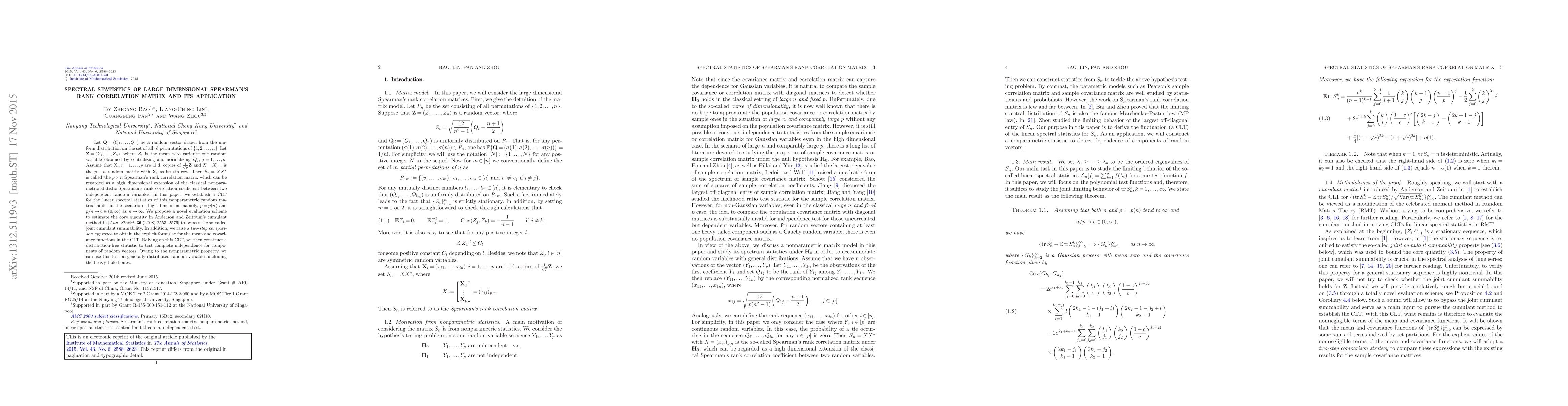 Let $\mathbf{Q}=(Q_1,\ldots,Q_n)$ be a random vector drawn from the uniform distribution on the set of all $n!$ permutations of $\{1,2,\ldots,n\}$. Let $\mathbf{Z}=(Z_1,\ldots,Z_n)$, where $Z_j$ is the mean zero variance one random variable obtained by centralizing and normalizing $Q_j$, $j=1,\ldots,n$. Assume that $\mathbf {X}_i,i=1,\ldots ,p$ are i.i.d. copies of $\frac{1}{\sqrt{p}}\mathbf{Z}$ and $X=X_{p,n}$ is the $p\times n$ random matrix with $\mathbf{X}_i$ as its $i$th row. Then $S_n=XX^*$ is called the $p\times n$ Spearman's rank correlation matrix which can be regarded as a high dimensional extension of the classical nonparametric statistic Spearman's rank correlation coefficient between two independent random variables. In this paper, we establish a CLT for the linear spectral statistics of this nonparametric random matrix model in the scenario of high dimension, namely, $p=p(n)$ and $p/n\to c\in(0,\infty)$ as $n\to\infty$. We propose a novel evaluation scheme to estimate the core quantity in Anderson and Zeitouni's cumulant method in [Ann. Statist. 36 (2008) 2553-2576] to bypass the so-called joint cumulant summability. In addition, we raise a two-step comparison approach to obtain the explicit formulae for the mean and covariance functions in the CLT. Relying on this CLT, we then construct a distribution-free statistic to test complete independence for components of random vectors. Owing to the nonparametric property, we can use this test on generally distributed random variables including the heavy-tailed ones.