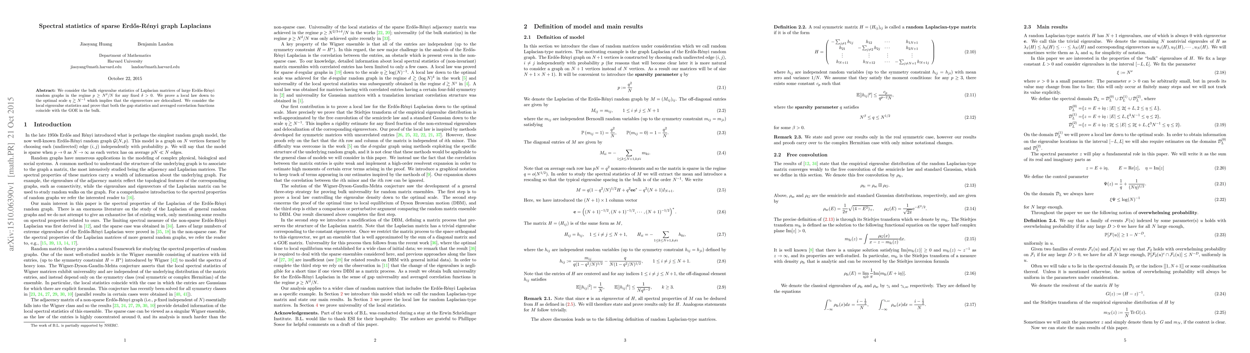 This paper investigates the spectral statistics of Laplacian matrices from large sparse Erdős-Rényi random graphs, proving a local law and demonstrating that the eigenvalue statistics match those of the Gaussian Orthogonal Ensemble (GOE) in the bulk. The study shows delocalized eigenvectors and confirms the convergence of gap statistics and correlation functions to GOE behavior.