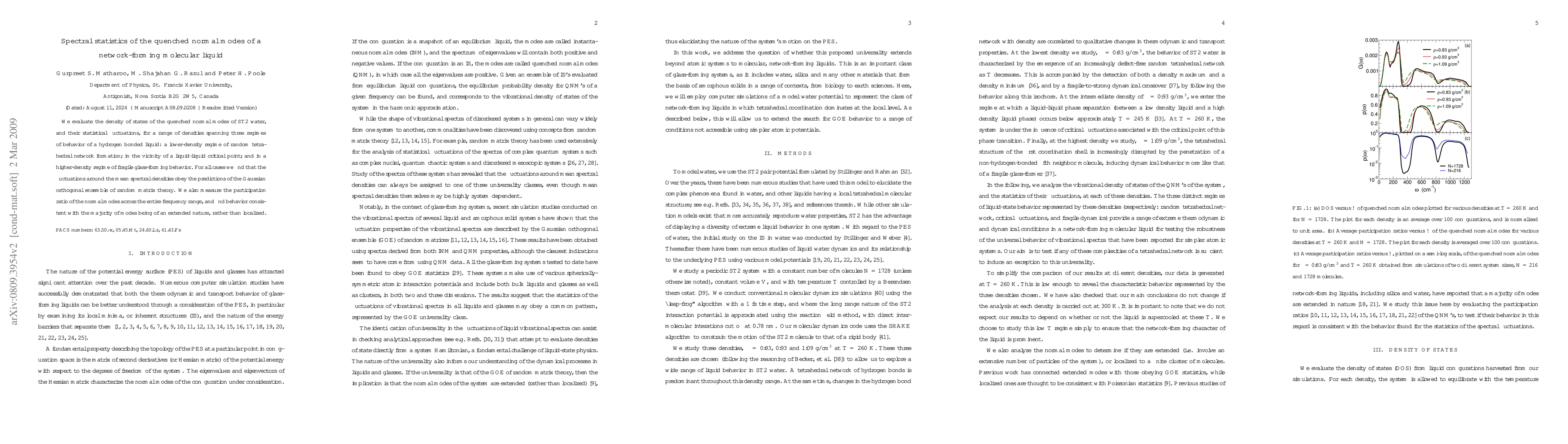 We evaluate the density of states of the quenched normal modes of ST2 water, and their statistical fluctuations, for a range of densities spanning three regimes of behavior of a hydrogen bonded liquid: a lower-density regime of random tetrahedral network formation; in the vicinity of a liquid-liquid critical point; and in a higher-density regime of fragile glass-forming behavior. For all cases we find that the fluctuations around the mean spectral densities obey the predictions of the Gaussian orthogonal ensemble of random matrix theory. We also measure the participation ratio of the normal modes across the entire frequency range, and find behavior consistent with the majority of modes being of an extended nature, rather than localized.