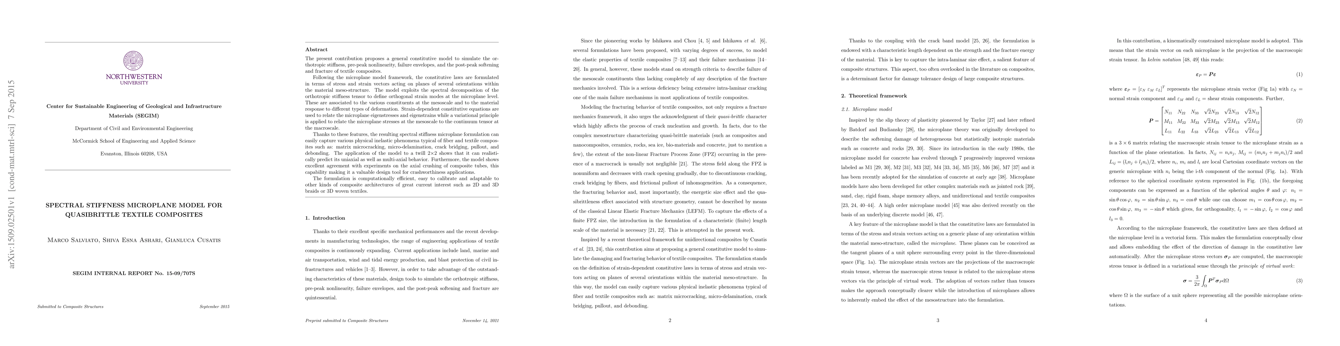 This paper proposes a spectral stiffness microplane model to simulate the complex behavior of textile composites, including orthotropic stiffness, pre-peak nonlinearity, and post-peak fracture. The model effectively captures phenomena like matrix cracking and debonding, demonstrating its accuracy through successful predictions of uniaxial and multi-axial behaviors in twill composites and axial crushing of composite tubes.