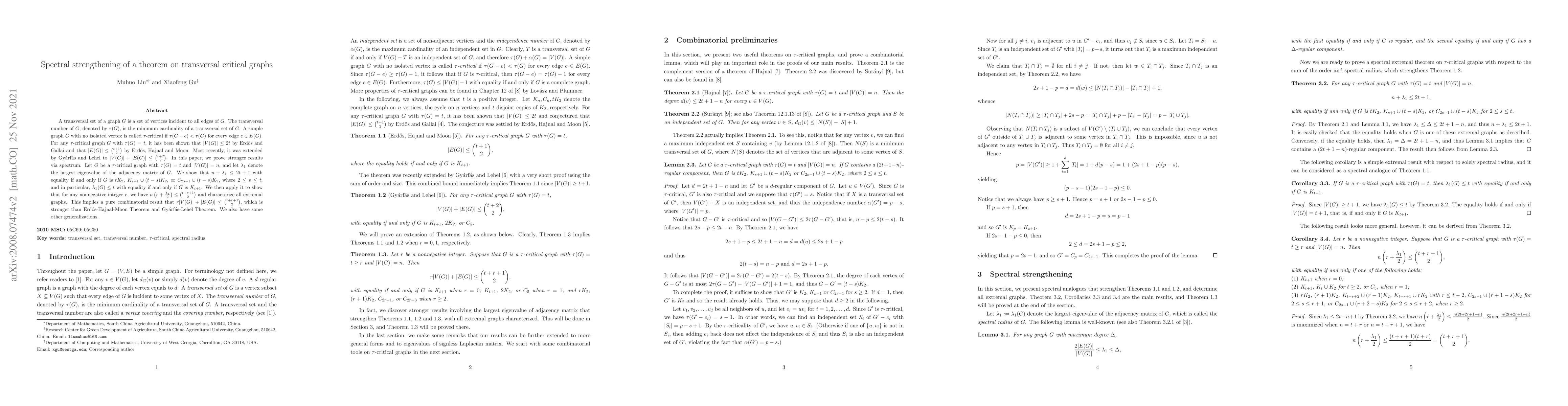 A transversal set of a graph $G$ is a set of vertices incident to all edges of $G$. The transversal number of $G$, denoted by $\tau(G)$, is the minimum cardinality of a transversal set of $G$. A simple graph $G$ with no isolated vertex is called $\tau$-critical if $\tau(G-e) < \tau(G)$ for every edge $e\in E(G)$. For any $\tau$-critical graph $G$ with $\tau(G)=t$, it has been shown that $|V(G)|\le 2t$ by Erd\H{o}s and Gallai and that $|E(G)|\le {t+1\choose 2}$ by Erd\H{o}s, Hajnal and Moon. Most recently, it was extended by Gy\'arf\'as and Lehel to $|V(G)| + |E(G)|\le {t+2\choose 2}$. In this paper, we prove stronger results via spectrum. Let $G$ be a $\tau$-critical graph with $\tau(G)=t$ and $|V(G)|=n$, and let $\lambda_1$ denote the largest eigenvalue of the adjacency matrix of $G$. We show that $n + \lambda_1\le 2t+1$ with equality if and only if $G$ is $tK_2$, $K_{s+1}\cup (t-s)K_2$, or $C_{2s-1}\cup (t-s)K_2$, where $2\leq s\leq t$; and in particular, $\lambda_1(G)\le t$ with equality if and only if $G$ is $K_{t+1}$. We then apply it to show that for any nonnegative integer $r$, we have $n\left(r+ \frac{\lambda_1}{2}\right) \le {t+r+1\choose 2}$ and characterize all extremal graphs. This implies a pure combinatorial result that $r|V(G)| + |E(G)| \le {t+r+1\choose 2}$, which is stronger than Erd\H{o}s-Hajnal-Moon Theorem and Gy\'arf\'as-Lehel Theorem. We also have some other generalizations.