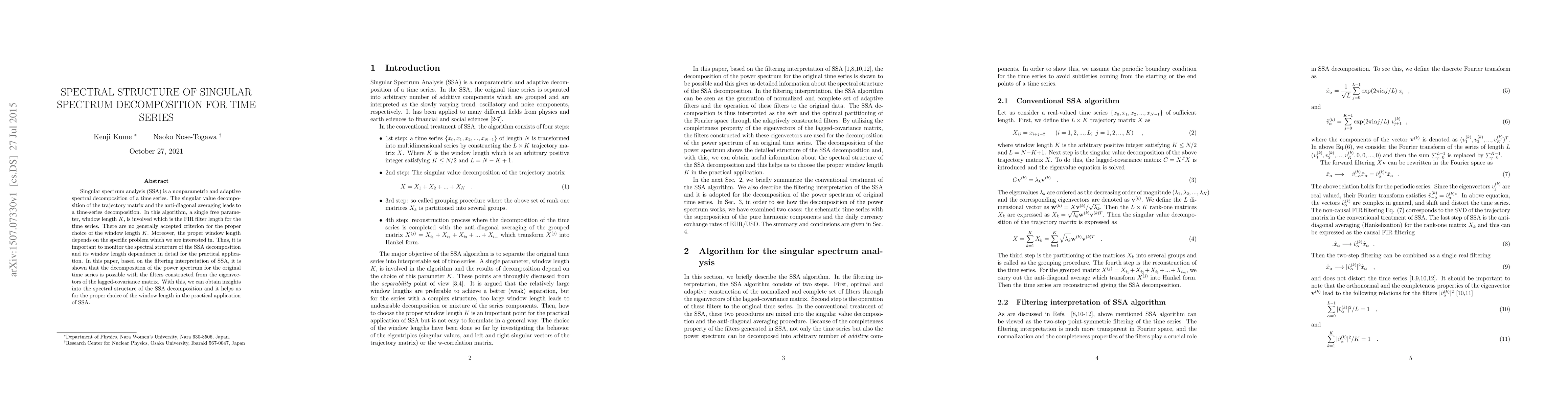 This paper explores the spectral structure of singular spectrum analysis (SSA) for time series decomposition, focusing on the window length parameter $K$. It demonstrates how SSA can decompose the power spectrum using filters derived from the lagged-covariance matrix, providing insights for selecting the optimal window length for practical applications.