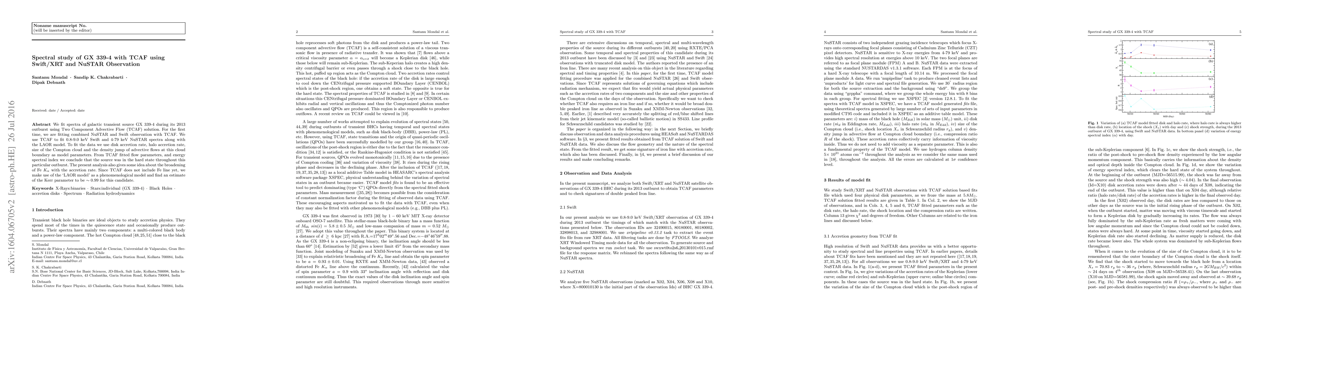 We fit spectra of galactic transient source GX~339-4 during its 2013 outburst using Two Component Advective Flow (TCAF) solution. For the first time, we are fitting combined NuSTAR and Swift observation with TCAF. We use TCAF to fit 0.8-9.0~keV Swift and 4-79 keV NuSTAR spectra along with the LAOR model. To fit the data we use disk accretion rate, halo accretion rate, size of the Compton cloud and the density jump of advective flows at this cloud boundary as model parameters. From TCAF fitted flow parameters, and energy spectral index we conclude that the source was in the hard state throughout this particular outburst. The present analysis also gives some idea about the broadening of Fe $K_{\alpha}$ with the accretion rate. Since TCAF does not include Fe line yet, we make use of the `LAOR model' as a phenomenological model and find an estimate of the Kerr parameter to be $\sim 0.99$ for this candidate.