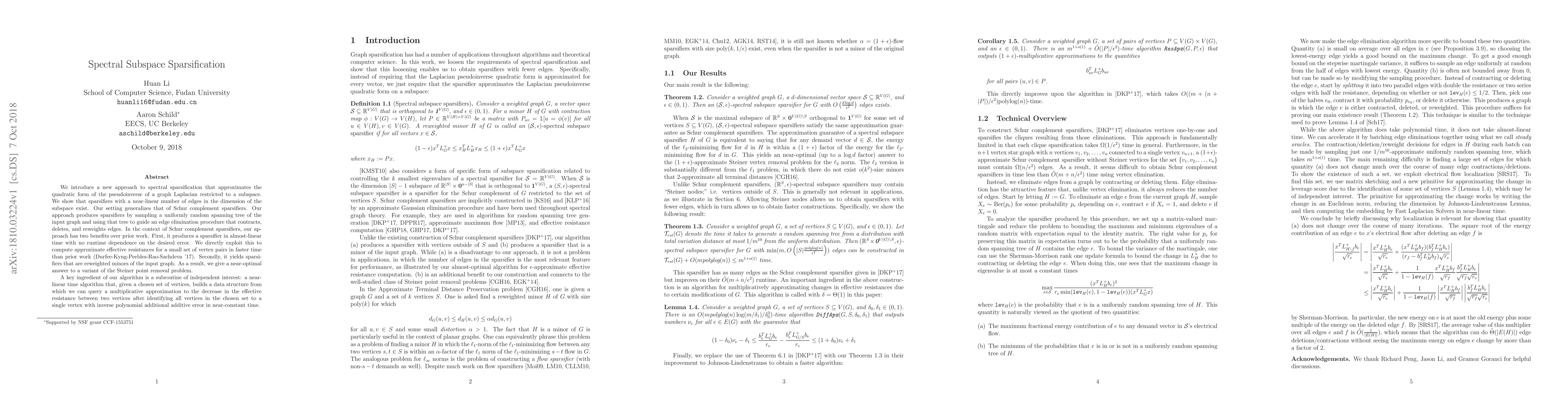 This research introduces a novel spectral sparsification method approximating a graph Laplacian's quadratic form in subspaces, requiring near-linear edges. It outperforms previous work by providing faster, reweighted graph minors as sparsifiers, solving a Steiner point removal problem variant efficiently. A key component is a near-linear time algorithm for approximating effective resistance changes.