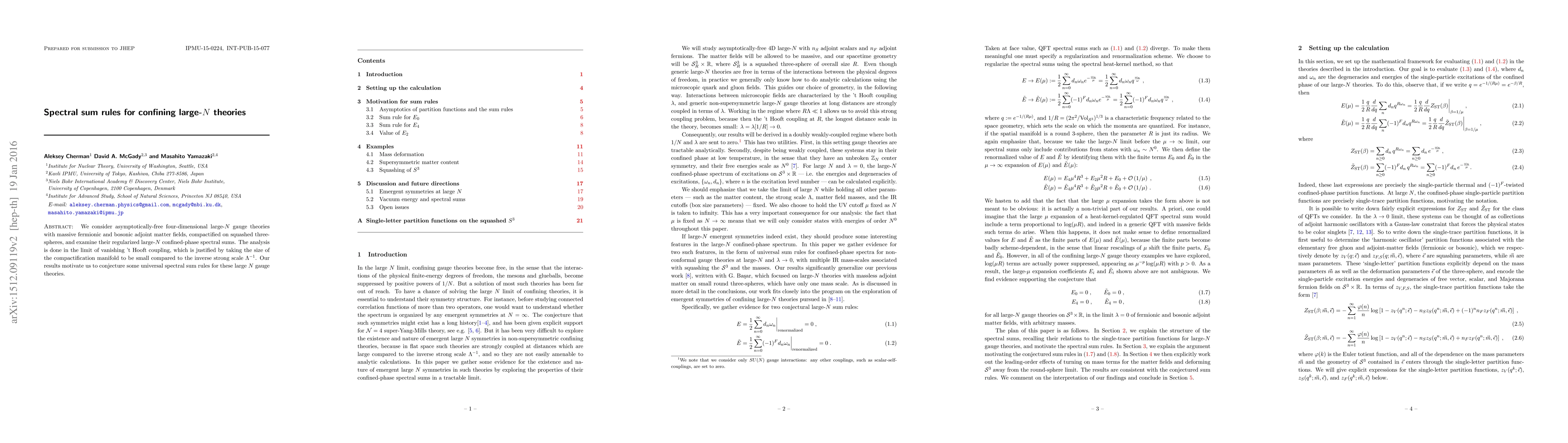 We consider asymptotically-free four-dimensional large-$N$ gauge theories with massive fermionic and bosonic adjoint matter fields, compactified on squashed three-spheres, and examine their regularized large-$N$ confined-phase spectral sums. The analysis is done in the limit of vanishing 't Hooft coupling, which is justified by taking the size of the compactification manifold to be small compared to the inverse strong scale $\Lambda^{-1}$. Our results motivate us to conjecture some universal spectral sum rules for these large $N$ gauge theories.