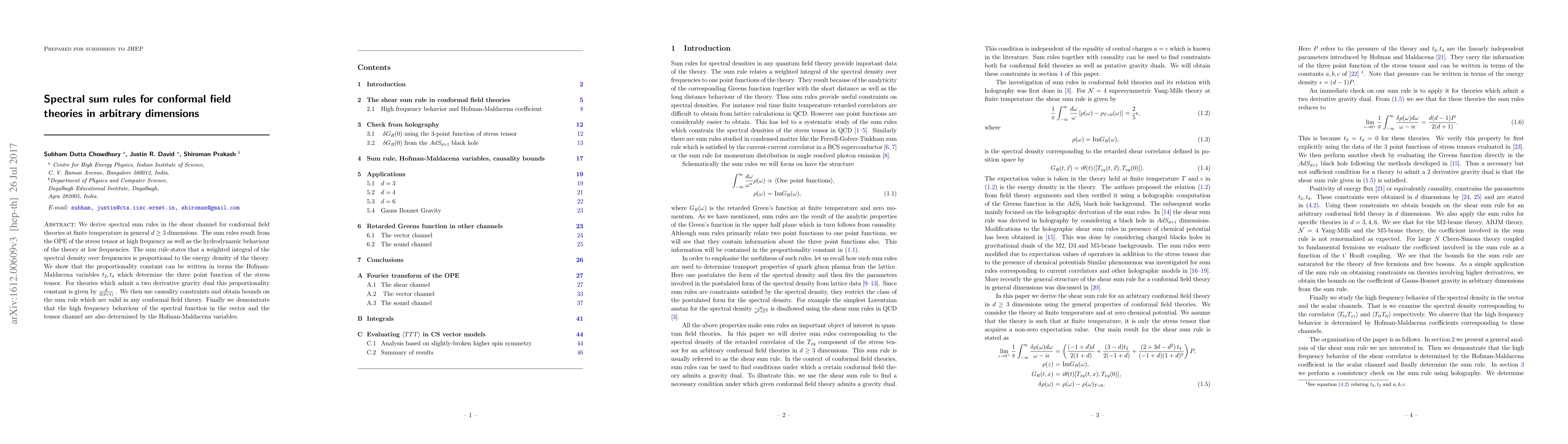 We derive spectral sum rules in the shear channel for conformal field theories at finite temperature in general $d\geq 3$ dimensions. The sum rules result from the OPE of the stress tensor at high frequency as well as the hydrodynamic behaviour of the theory at low frequencies. The sum rule states that a weighted integral of the spectral density over frequencies is proportional to the energy density of the theory. We show that the proportionality constant can be written in terms the Hofman-Maldacena variables $t_2, t_4$ which determine the three point function of the stress tensor. For theories which admit a two derivative gravity dual this proportionality constant is given by $\frac{d}{2(d+1)}$. We then use causality constraints and obtain bounds on the sum rule which are valid in any conformal field theory. Finally we demonstrate that the high frequency behaviour of the spectral function in the vector and the tensor channel are also determined by the Hofman-Maldacena variables.