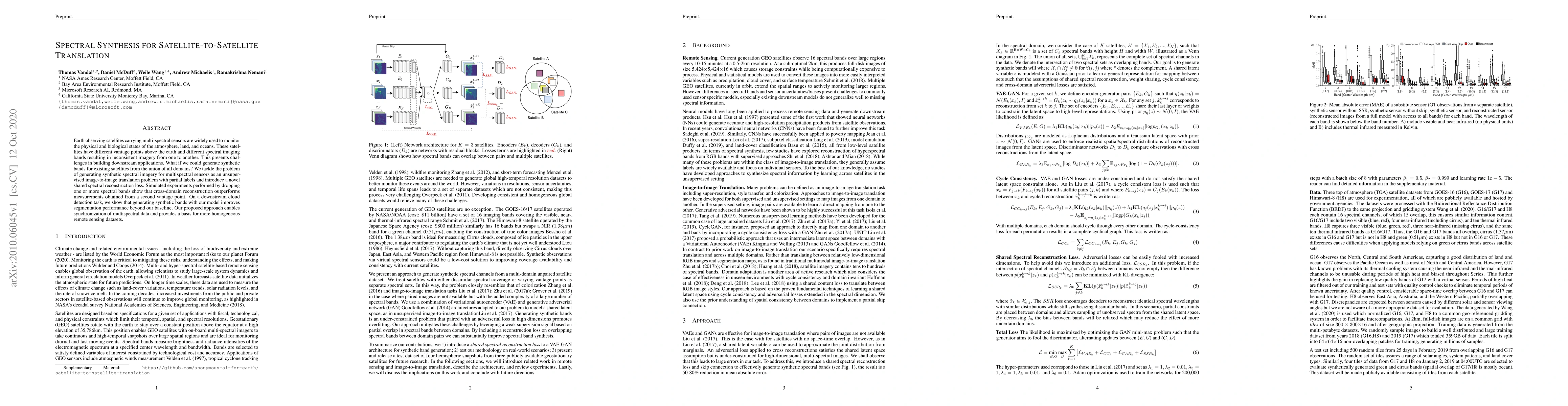 Earth observing satellites carrying multi-spectral sensors are widely used to monitor the physical and biological states of the atmosphere, land, and oceans. These satellites have different vantage points above the earth and different spectral imaging bands resulting in inconsistent imagery from one to another. This presents challenges in building downstream applications. What if we could generate synthetic bands for existing satellites from the union of all domains? We tackle the problem of generating synthetic spectral imagery for multispectral sensors as an unsupervised image-to-image translation problem with partial labels and introduce a novel shared spectral reconstruction loss. Simulated experiments performed by dropping one or more spectral bands show that cross-domain reconstruction outperforms measurements obtained from a second vantage point. On a downstream cloud detection task, we show that generating synthetic bands with our model improves segmentation performance beyond our baseline. Our proposed approach enables synchronization of multispectral data and provides a basis for more homogeneous remote sensing datasets.