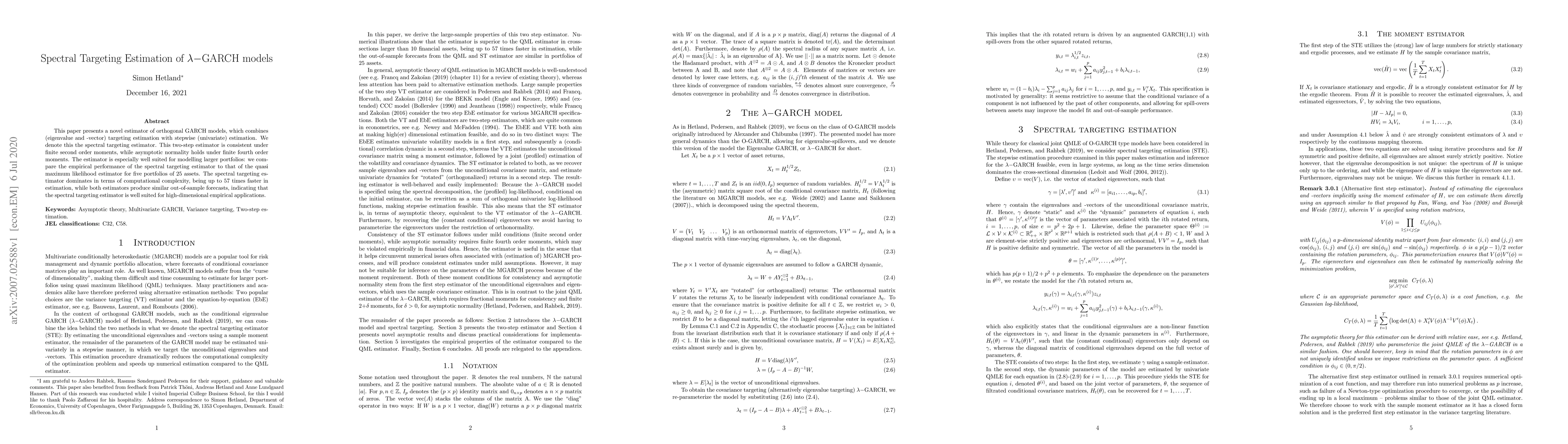 This paper presents a novel estimator of orthogonal GARCH models, which combines (eigenvalue and -vector) targeting estimation with stepwise (univariate) estimation. We denote this the spectral targeting estimator. This two-step estimator is consistent under finite second order moments, while asymptotic normality holds under finite fourth order moments. The estimator is especially well suited for modelling larger portfolios: we compare the empirical performance of the spectral targeting estimator to that of the quasi maximum likelihood estimator for five portfolios of 25 assets. The spectral targeting estimator dominates in terms of computational complexity, being up to 57 times faster in estimation, while both estimators produce similar out-of-sample forecasts, indicating that the spectral targeting estimator is well suited for high-dimensional empirical applications.