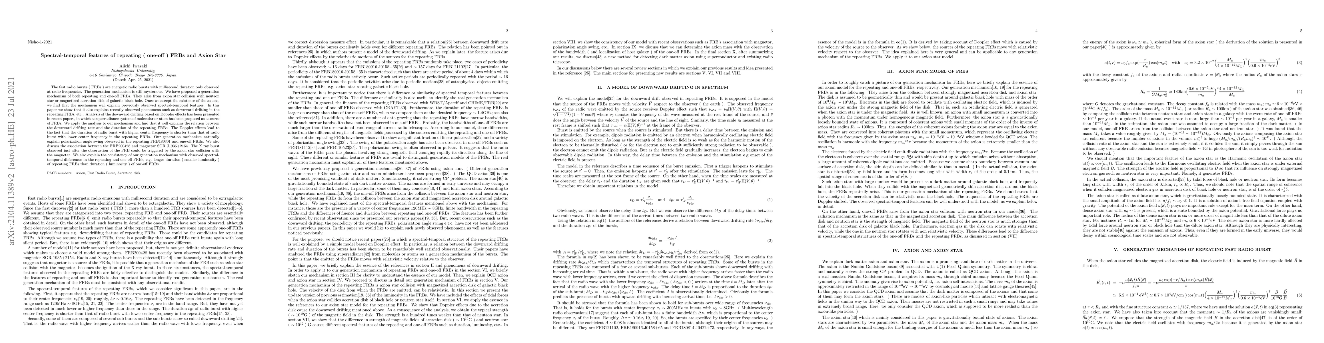 The fast radio bursts ( FRBs ) are energetic radio bursts with millisecond duration only observed at radio frequencies. The generation mechanism is still mysterious. We have proposed a generation mechanism of both repeating and one-off FRBs. They arise from the axion star collision with neutron star or magnetized accretion disk of galactic black hole. Once we accept the existence of the axions, we find that the mechanism well explain previously observed spectral-temporal features. In this paper we show that it also explains recently observed phenomena such as downward drifting in the repeating FRBs, etc.. Analysis of the downward drifting based on Doppler effects has been presented in recent papers, in which a superradiance system of molecular or atom has been proposed as a source of FRBs. We apply the analysis to our mechanism and find that it well explains the relation between the downward drifting rate and the duration of the repeating FRBs. The Doppler effects lead to the fact that the duration of radio burst with higher center frequency is shorter than that of radio burst with lower center frequency in the repeating FRBs. Our generation mechanism naturally explain polarization angle swing observed in the repeating FRB180301 and one-off FRBs. We also discuss the association between the FRB200428 and magnetar SGR J1935+2154. The X ray burst observed just after the observation of the FRB could be triggered by the axion star collision with the magnetar. We also explain the consistency of our generation mechanism with observed spectral-temporal differences in the repeating and one-off FRBs, e.g. longer duration ( smaller flux density ) of repeating FRBs than duration ( flux density ) of one-off FRBs.