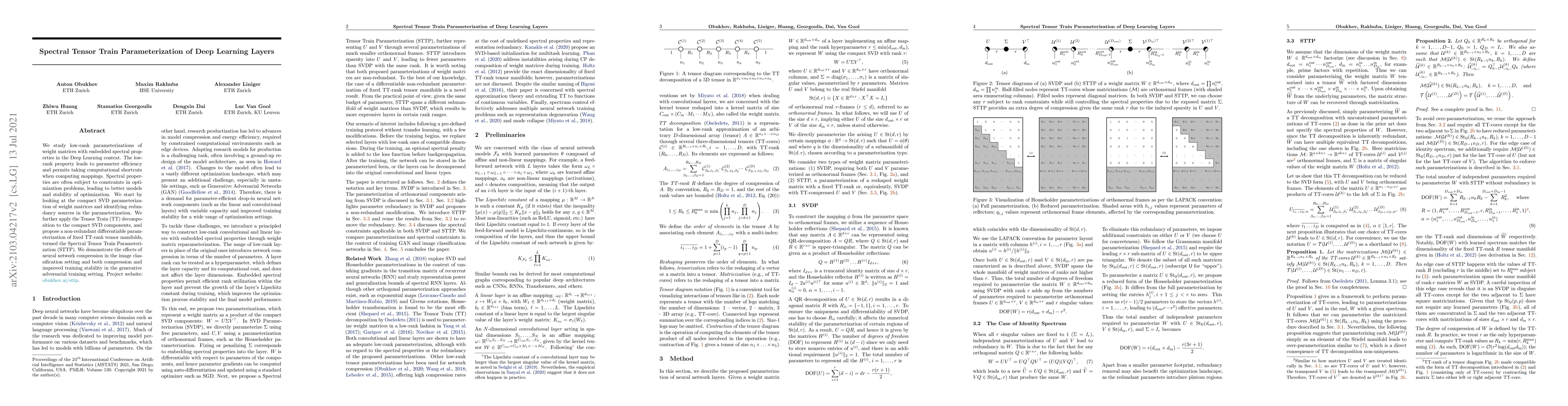 We study low-rank parameterizations of weight matrices with embedded spectral properties in the Deep Learning context. The low-rank property leads to parameter efficiency and permits taking computational shortcuts when computing mappings. Spectral properties are often subject to constraints in optimization problems, leading to better models and stability of optimization. We start by looking at the compact SVD parameterization of weight matrices and identifying redundancy sources in the parameterization. We further apply the Tensor Train (TT) decomposition to the compact SVD components, and propose a non-redundant differentiable parameterization of fixed TT-rank tensor manifolds, termed the Spectral Tensor Train Parameterization (STTP). We demonstrate the effects of neural network compression in the image classification setting and both compression and improved training stability in the generative adversarial training setting.
