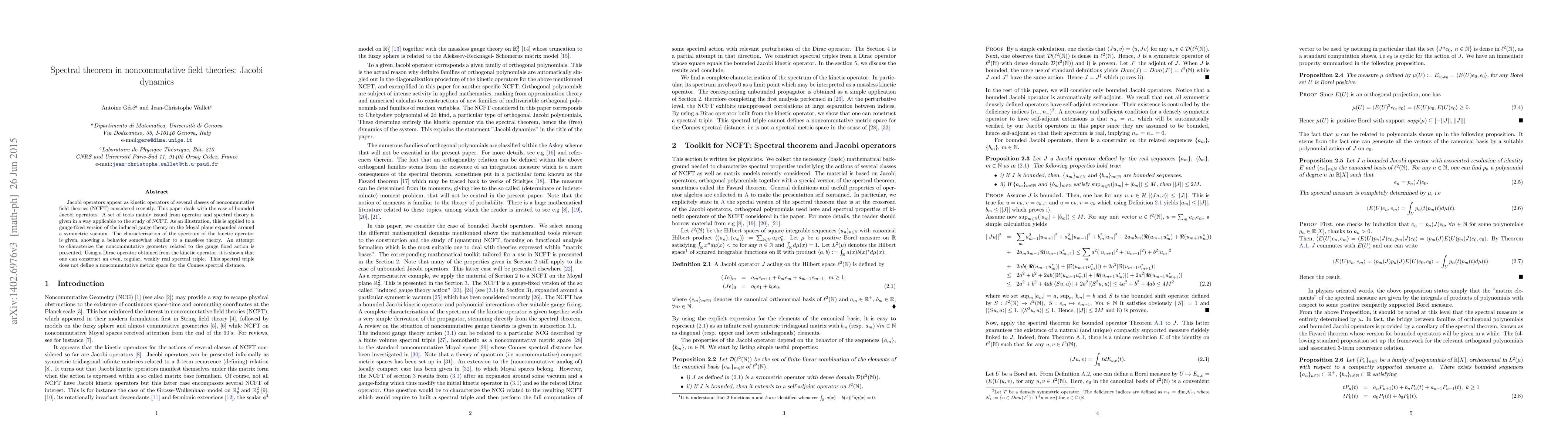 Jacobi operators appear as kinetic operators of several classes of noncommutative field theories (NCFT) considered recently. This paper deals with the case of bounded Jacobi operators. A set of tools mainly issued from operator and spectral theory is given in a way applicable to the study of NCFT. As an illustration, this is applied to a gauge-fixed version of the induced gauge theory on the Moyal plane expanded around a symmetric vacuum. The characterization of the spectrum of the kinetic operator is given, showing a behavior somewhat similar to a massless theory. An attempt to characterize the noncommutative geometry related to the gauge fixed action is presented. Using a Dirac operator obtained from the kinetic operator, it is shown that one can construct an even, regular, weakly real spectral triple. This spectral triple does not define a noncommutative metric space for the Connes spectral distance.