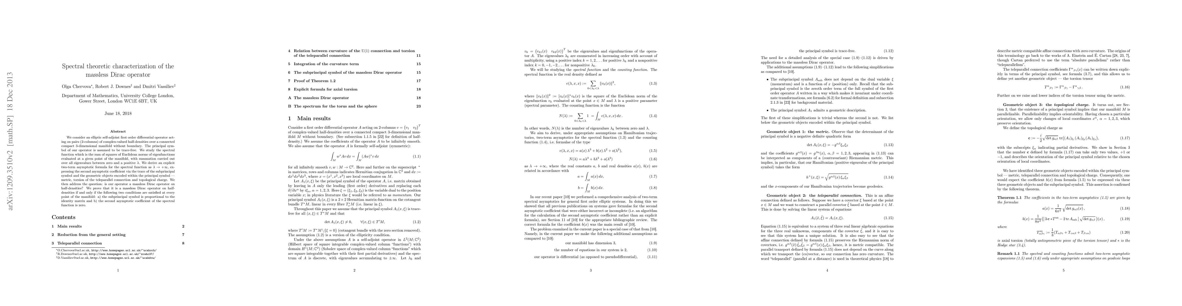 We consider an elliptic self-adjoint first order differential operator acting on pairs (2-columns) of complex-valued half-densities over a connected compact 3-dimensional manifold without boundary. The principal symbol of our operator is assumed to be trace-free. We study the spectral function which is the sum of squares of Euclidean norms of eigenfunctions evaluated at a given point of the manifold, with summation carried out over all eigenvalues between zero and a positive lambda. We derive an explicit two-term asymptotic formula for the spectral function as lambda tends to plus infinity, expressing the second asymptotic coefficient via the trace of the subprincipal symbol and the geometric objects encoded within the principal symbol - metric, torsion of the teleparallel connection and topological charge. We then address the question: is our operator a massless Dirac operator on half-densities? We prove that it is a massless Dirac operator on half-densities if and only if the following two conditions are satisfied at every point of the manifold: a) the subprincipal symbol is proportional to the identity matrix and b) the second asymptotic coefficient of the spectral function is zero.