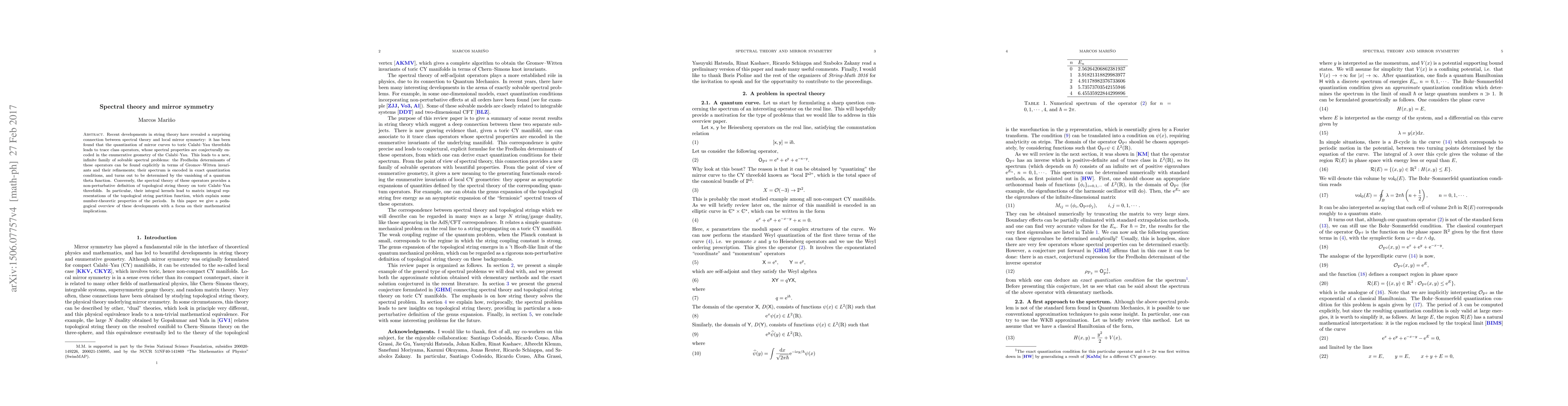 Recent developments in string theory have revealed a surprising connection between spectral theory and local mirror symmetry: it has been found that the quantization of mirror curves to toric Calabi-Yau threefolds leads to trace class operators, whose spectral properties are conjecturally encoded in the enumerative geometry of the Calabi-Yau. This leads to a new, infinite family of solvable spectral problems: the Fredholm determinants of these operators can be found explicitly in terms of Gromov-Witten invariants and their refinements; their spectrum is encoded in exact quantization conditions, and turns out to be determined by the vanishing of a quantum theta function. Conversely, the spectral theory of these operators provides a non-perturbative definition of topological string theory on toric Calabi-Yau threefolds. In particular, their integral kernels lead to matrix integral representations of the topological string partition function, which explain some number-theoretic properties of the periods. In this paper we give a pedagogical overview of these developments with a focus on their mathematical implications