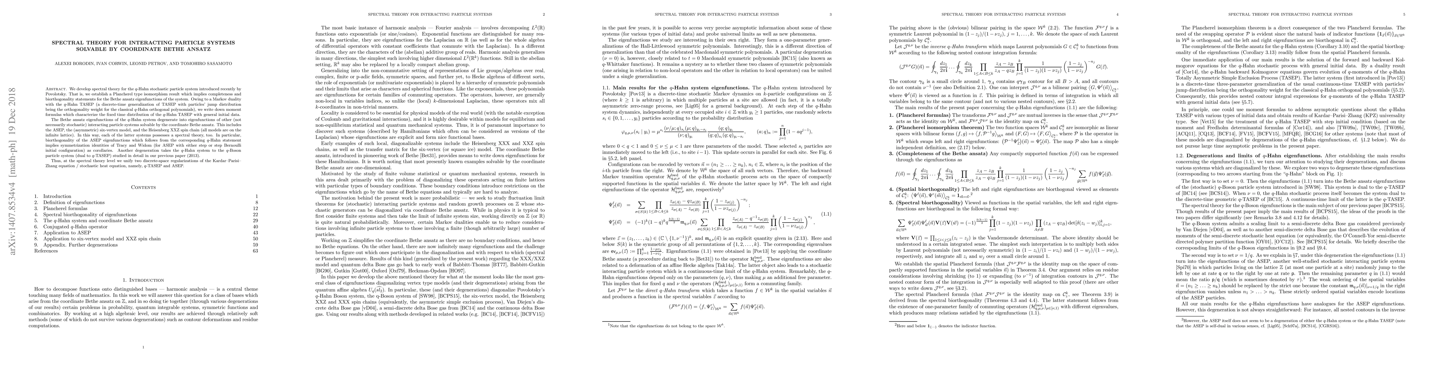 We develop spectral theory for the q-Hahn stochastic particle system introduced recently by Povolotsky. That is, we establish a Plancherel type isomorphism result which implies completeness and biorthogonality statements for the Bethe ansatz eigenfunctions of the system. Owing to a Markov duality with the q-Hahn TASEP (a discrete-time generalization of TASEP with particles' jump distribution being the orthogonality weight for the classical q-Hahn orthogonal polynomials), we write down moment formulas which characterize the fixed time distribution of the q-Hahn TASEP with general initial data. The Bethe ansatz eigenfunctions of the q-Hahn system degenerate into eigenfunctions of other (not necessarily stochastic) interacting particle systems solvable by the coordinate Bethe ansatz. This includes the ASEP, the (asymmetric) six-vertex model, and the Heisenberg XXZ spin chain (all models are on the infinite lattice). In this way, each of the latter systems possesses a spectral theory, too. In particular, biorthogonality of the ASEP eigenfunctions which follows from the corresponding q-Hahn statement implies symmetrization identities of Tracy and Widom (for ASEP with either step or step Bernoulli initial configuration) as corollaries. Another degeneration takes the q-Hahn system to the q-Boson particle system (dual to q-TASEP) studied in detail in our previous paper (2013). Thus, at the spectral theory level we unify two discrete-space regularizations of the Kardar-Parisi-Zhang equation / stochastic heat equation, namely, q-TASEP and ASEP.