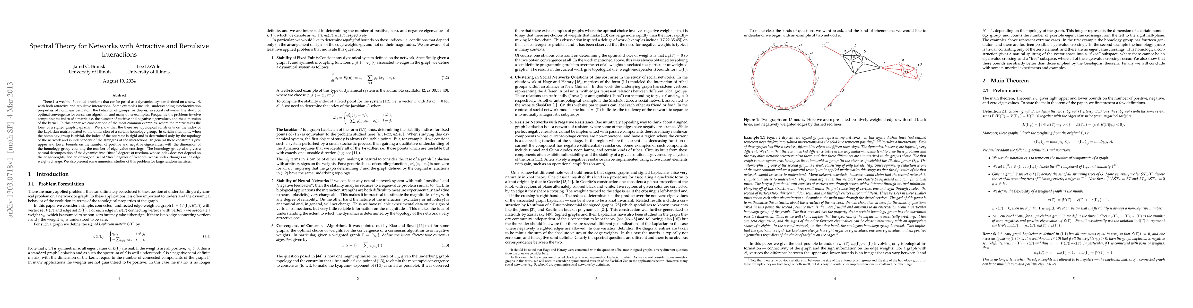This paper explores spectral theory for networks with both attractive and repulsive interactions, focusing on the signed graph Laplacian matrix. It reveals topological constraints on the matrix's index, showing that under certain conditions, the index is determined solely by network topology, independent of interaction strengths. The study also introduces a homology group to decompose dynamics into fixed and free degrees of freedom.