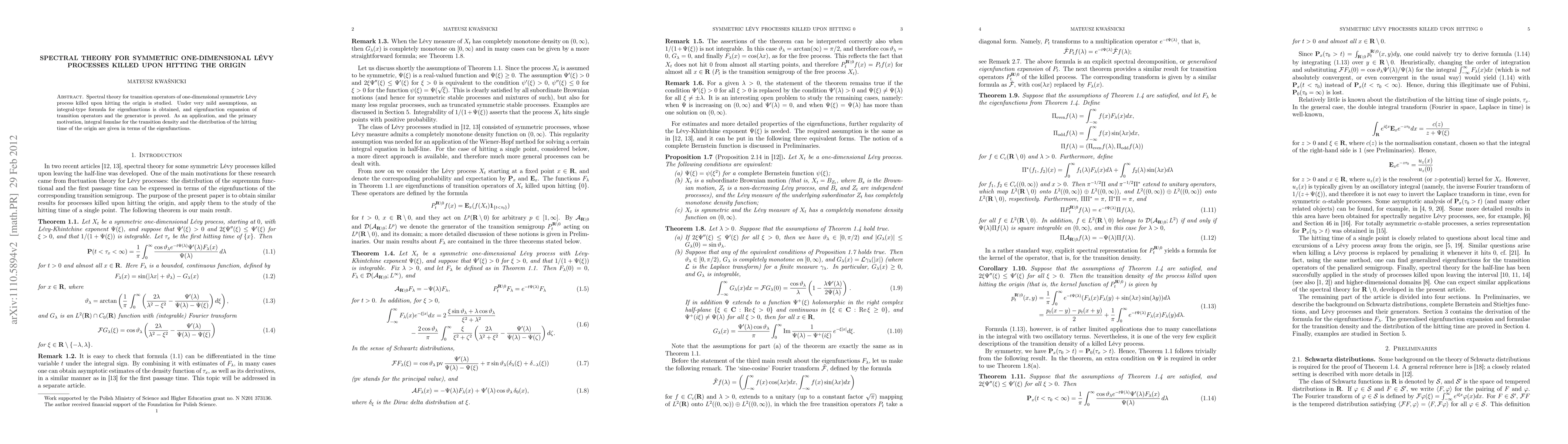 This paper studies the spectral theory of one-dimensional symmetric Levy processes terminated upon reaching the origin, deriving an integral-type formula for eigenfunctions and providing eigenfunction expansion for transition operators and the generator. Applications include integral formulae for transition density and the distribution of the hitting time at the origin.