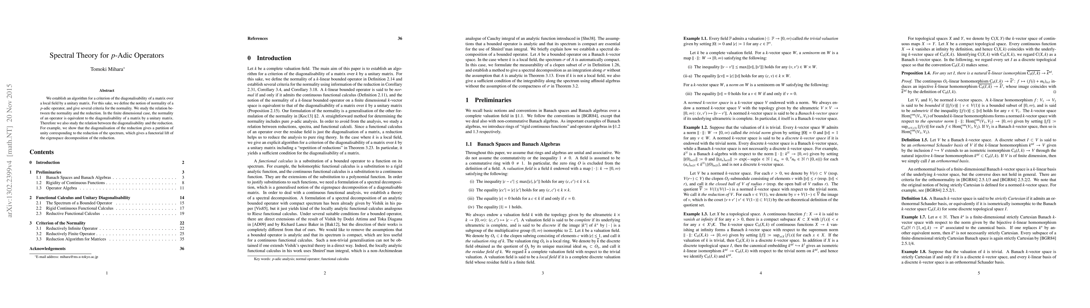 We establish an algorithm for a criterion of the diagonalisability of a matrix over a local field by a unitary matrix. For this sake, we define the notion of normality of a $p$-adic operator, and give several criteria for the normality. We study the relation between the normality and the reduction. In the finite dimensional case, the normality of an operator is equivalent to the diagonalisability of a matrix by a unitary matrix. Therefore we also study the relation between the diagonalisability and the reduction. For example, we show that the diagonalisation of the reduction gives a partition of unity corresponding to the reduction of the spectrum, which gives a functorial lift of the eigenspace decomposition of the reduction.