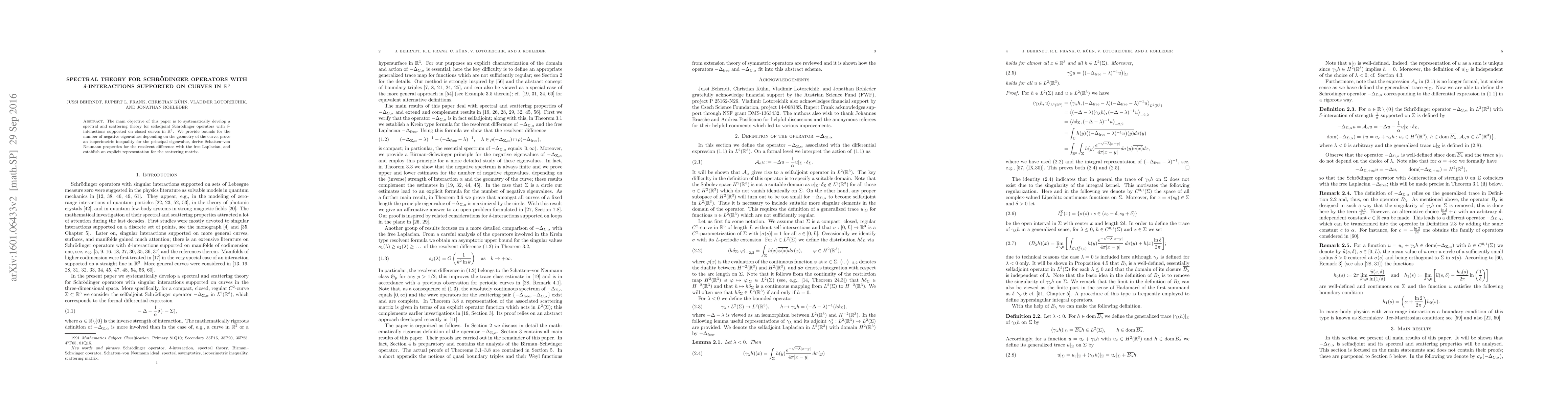 This paper develops a spectral and scattering theory for selfadjoint Schrödinger operators with $\delta$-interactions on closed curves in $\mathbb R^3$, providing bounds for negative eigenvalues, an isoperimetric inequality, Schatten-von Neumann properties, and an explicit representation for the scattering matrix.