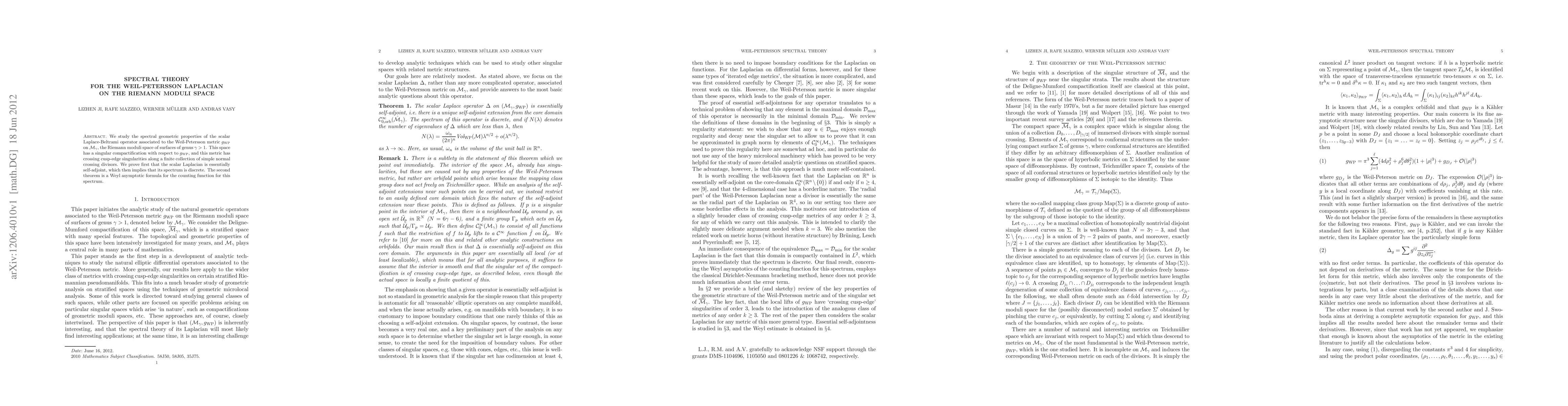 We study the spectral geometric properties of the scalar Laplace-Beltrami operator associated to the Weil-Petersson metric $g_{\mathrm{WP}}$ on $\mathcal M_\gamma$, the Riemann moduli space of surfaces of genus $\gamma > 1$. This space has a singular compactification with respect to $g_{\mathrm{WP}}$, and this metric has crossing cusp-edge singularities along a finite collection of simple normal crossing divisors. We prove first that the scalar Laplacian is essentially self-adjoint, which then implies that its spectrum is discrete. The second theorem is a Weyl asymptotic formula for the counting function for this spectrum.