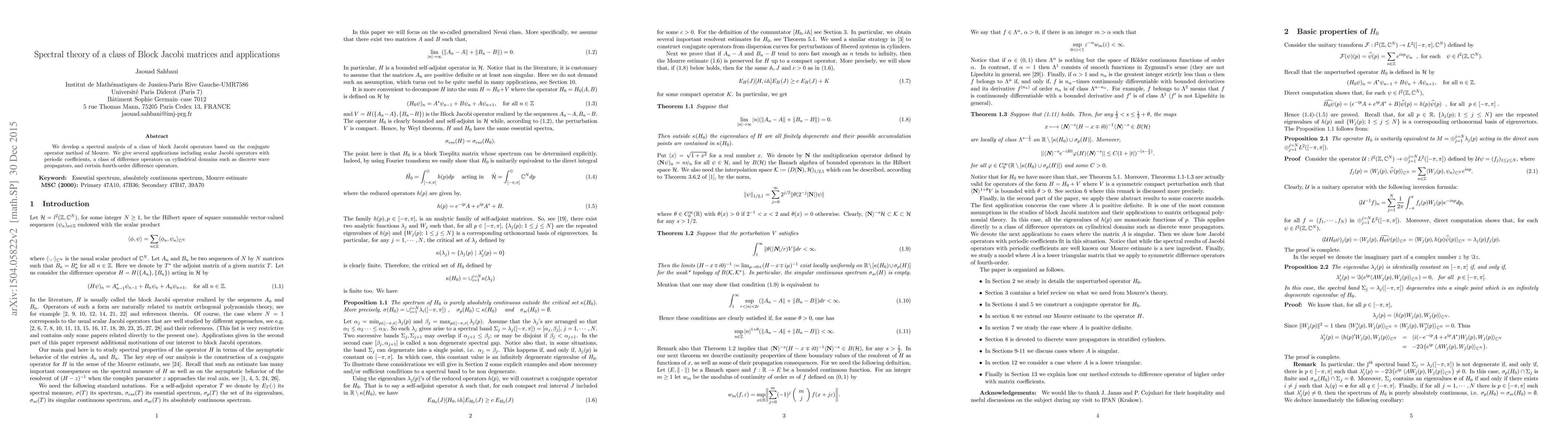 We develop a spectral analysis of a class of block Jacobi operators based on the conjugate operator method of Mourre. We give several applications including scalar Jacobi operators with periodic coefficients, a class of difference operators on cylindrical domains such as discrete wave propagators, and certain fourth-order difference operators.