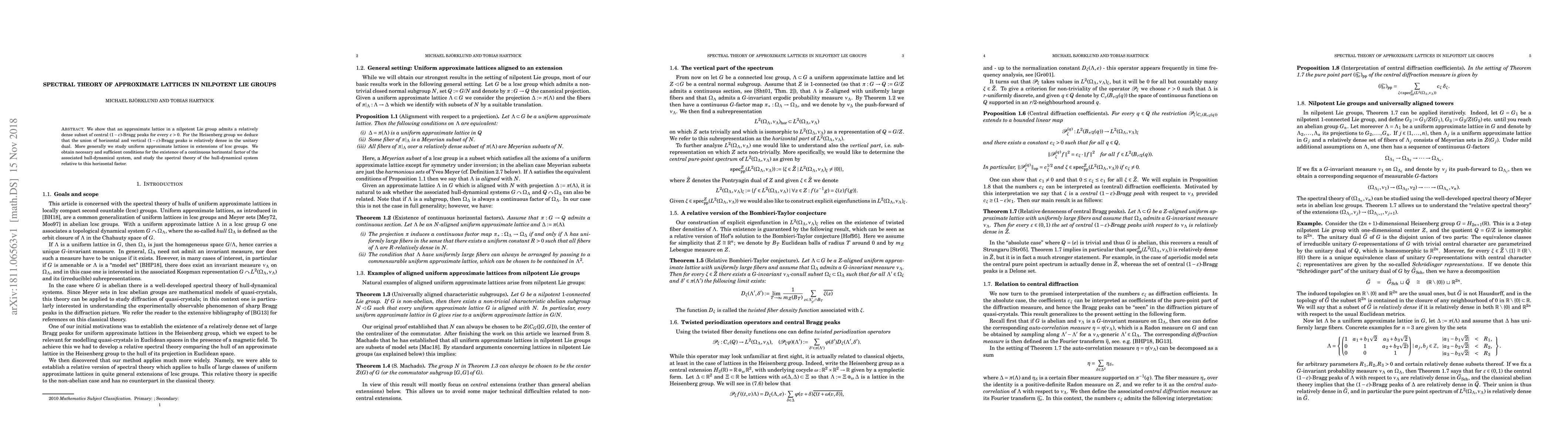 This paper demonstrates that approximate lattices in nilpotent Lie groups possess a dense subset of central $(1-\epsilon)$-Bragg peaks for any $\epsilon > 0$. For the Heisenberg group, it shows that the union of horizontal and vertical $(1-\epsilon)$-Bragg peaks is relatively dense in the unitary dual, and it explores the spectral theory of hull-dynamical systems in extensions of locally compact, separated (lcsc) groups.