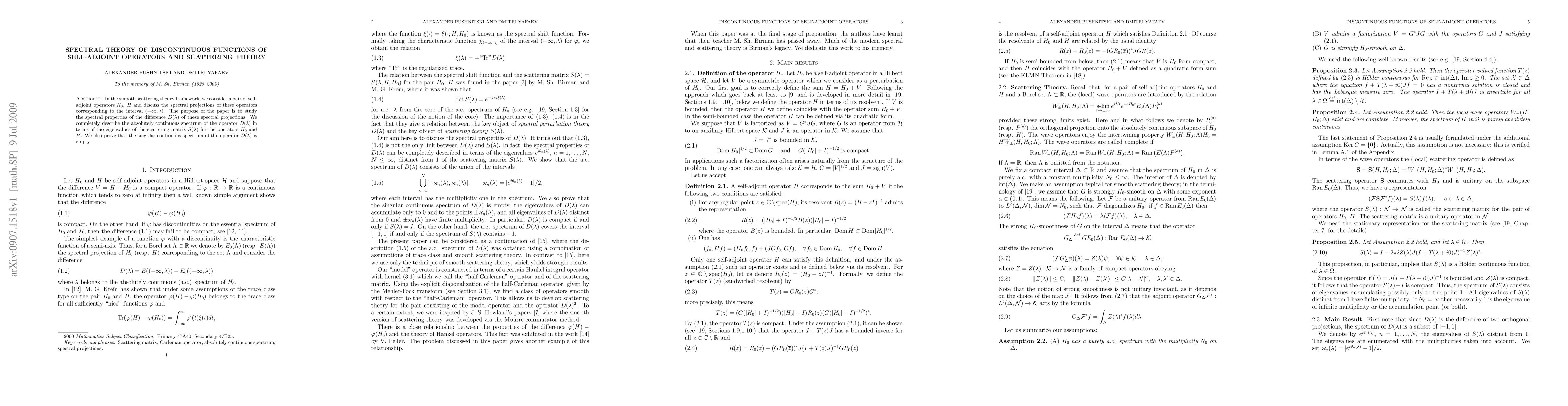 This paper investigates the spectral properties of self-adjoint operators $H_0$ and $H$ in scattering theory, focusing on the difference $D(\lambda)$ of their spectral projections for $(-\infty,\lambda)$. It describes the absolutely continuous spectrum of $D(\lambda)$ in terms of the scattering matrix eigenvalues and proves that $D(\lambda)$ has no singular continuous spectrum.