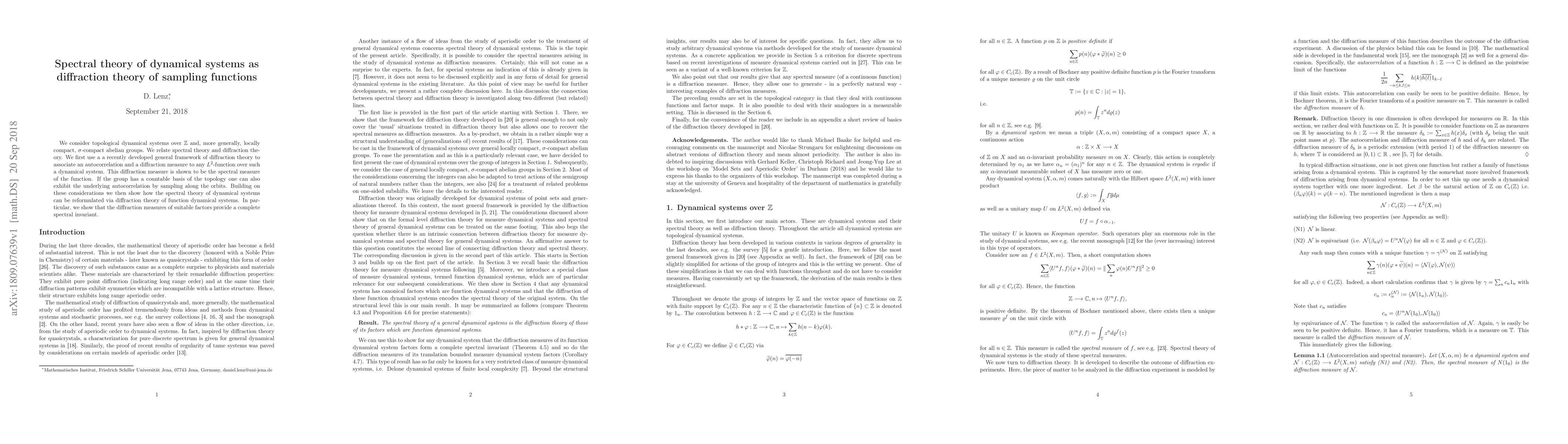 This paper establishes a connection between spectral theory of dynamical systems and diffraction theory of sampling functions, revealing a new framework for understanding the underlying structure of these systems.