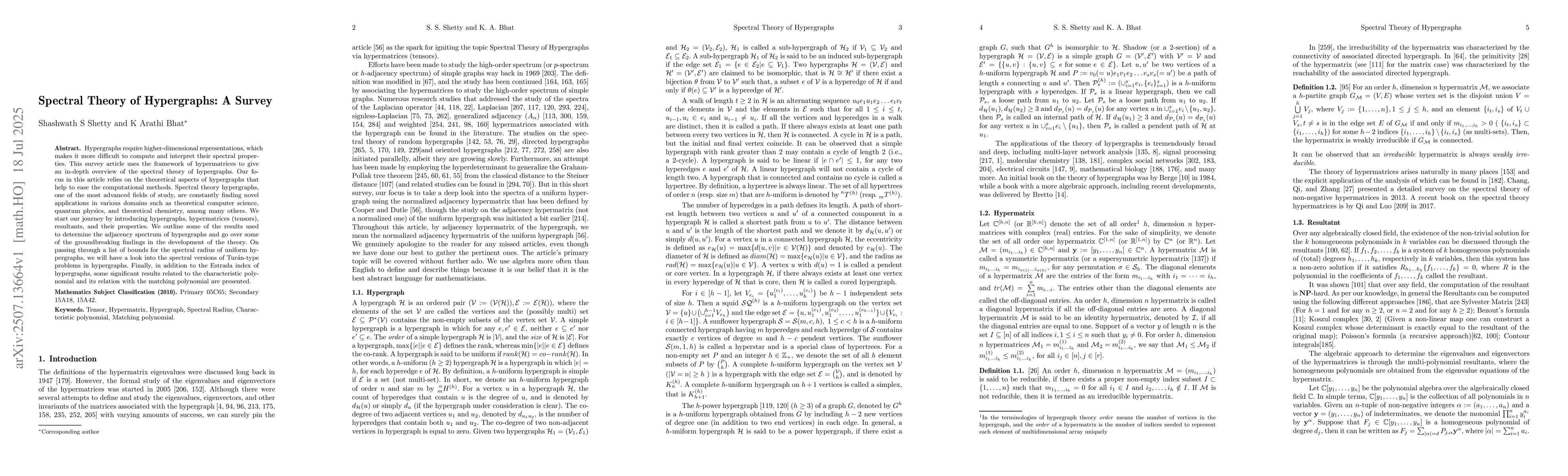 Hypergraphs require higher-dimensional representations, which makes it more difficult to compute and interpret their spectral properties. This survey article uses the framework of hypermatrices to give an in-depth overview of the spectral theory of hypergraphs. Our focus in this article relies on the theoretical aspects of hypergraphs that help to ease the computational methods. Spectral theory hypergraphs, one of the most advanced fields of study, are constantly finding novel applications in various domains such as theoretical computer science, quantum physics, and theoretical chemistry, among many others. We start our journey by introducing hypergraphs, hypermatrices (tensors), resultants, and their properties. We outline some of the results used to determine the adjacency spectrum of hypergraphs and go over some of the groundbreaking findings in the development of the theory. On passing through a list of bounds for the spectral radius of uniform hypergraphs, we will have a look into the spectral versions of Tur\'an-type problems in hypergraphs. Finally, in addition to the Estrada index of hypergraphs, some significant results related to the characteristic polynomial and its relationship with the matching polynomial are presented.