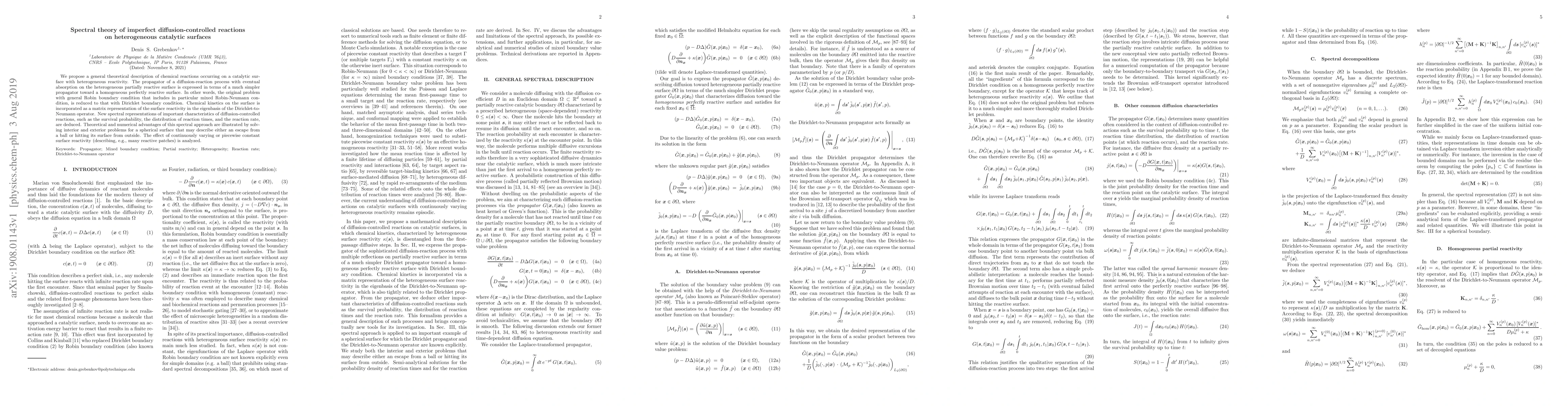 This paper develops a theoretical framework for diffusion-controlled reactions on heterogeneous catalytic surfaces, simplifying the problem by reducing it to a homogeneous case. It introduces spectral representations for key reaction characteristics and demonstrates the method's advantages through numerical solutions for spherical surfaces.