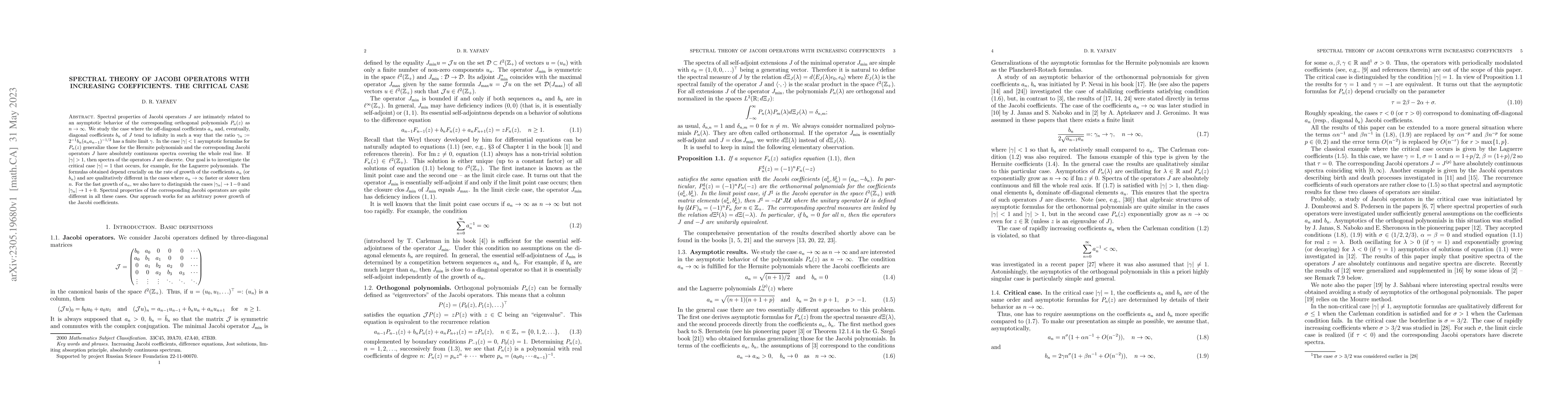 Spectral properties of Jacobi operators $J$ are intimately related to an asymptotic behavior of the corresponding orthogonal polynomials $P_{n}(z)$ as $n\to\infty$. We study the case where the off-diagonal coefficients $a_{n}$ and, eventually, diagonal coefficients $ b_{n}$ of $J$ tend to infinity in such a way that the ratio $\gamma_{n}:=2^{-1}b_{n} (a_{n}a_{n-1})^{-1/2} $ has a finite limit $ \gamma $. %We study an asymptotic behavior as $n\to\infty$ of the orthogonal polynomials $P_{n}(z)$ defined by Jacobi recurrence coefficients $a_{n}$ (off-diagonal terms) and $ b_{n}$ (diagonal terms). %We consider the case $a_{n}\to\infty$ and suppose that the sequence $\gamma_{n}:=2^{-1}b_{n} (a_{n}a_{n-1})^{-1/2} $ has a limit $ \gamma $ as $n\to\infty$. In the case $|\gamma | < 1$ asymptotic formulas for $P_{n}(z)$ generalize those for the Hermite polynomials and the corresponding Jacobi operators $J$ have absolutely continuous spectra covering the whole real line. If $|\gamma | > 1$, then spectra of the operators $J$ are discrete. Our goal is to investigate the critical case $| \gamma |=1$ that occurs, for example, for the Laguerre polynomials. The formulas obtained depend crucially on the rate of growth of the coefficients $a_{n}$ (or $b_{n}$) and are qualitatively different in the cases where $a_{n}\to \infty$ faster or slower then $n$. For the fast growth of $a_{n}$, we also have to distinguish the cases $|\gamma_{n}| \to 1-0$ and $|\gamma_{n}| \to 1+0$. Spectral properties of the corresponding Jacobi operators are quite different in all these cases. Our approach works for an arbitrary power growth of the Jacobi coefficients.