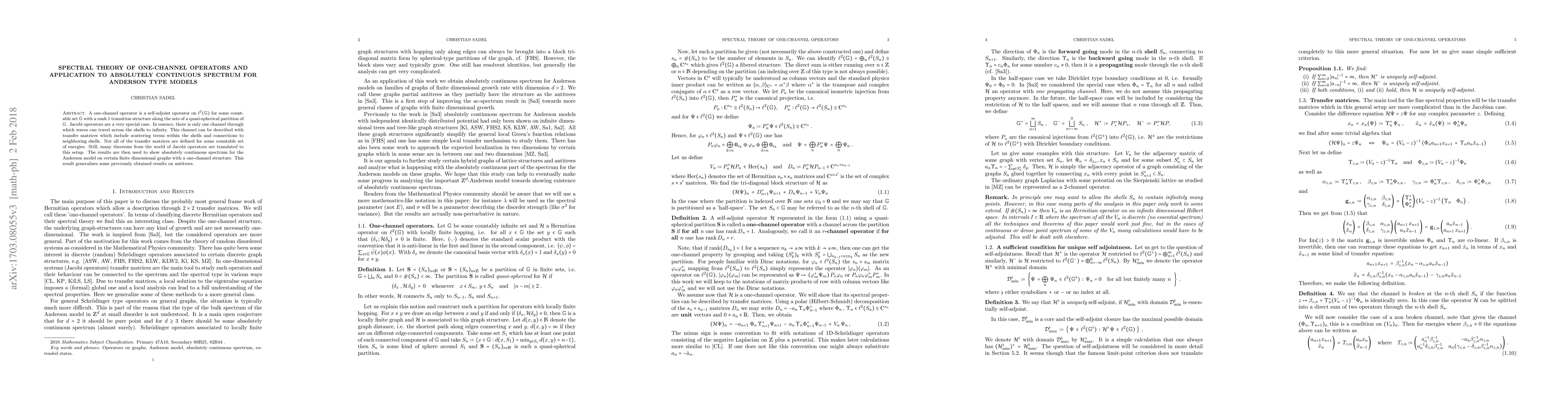 A one-channel operator is a self-adjoint operator on $\ell^2(\mathbb{G})$ for some countable set $\mathbb{G}$ with a rank 1 transition structure along the sets of a quasi-spherical partition of $\mathbb{G}$. Jacobi operators are a very special case. In essence, there is only one channel through which waves can travel across the shells to infinity. This channel can be described with transfer matrices which include scattering terms within the shells and connections to neighboring shells. Not all of the transfer matrices are defined for some countable set of energies. Still, many theorems from the world of Jacobi operators are translated to this setup. The results are then used to show absolutely continuous spectrum for the Anderson model on certain finite dimensional graphs with a one-channel structure. This result generalizes some previously obtained results on antitrees.