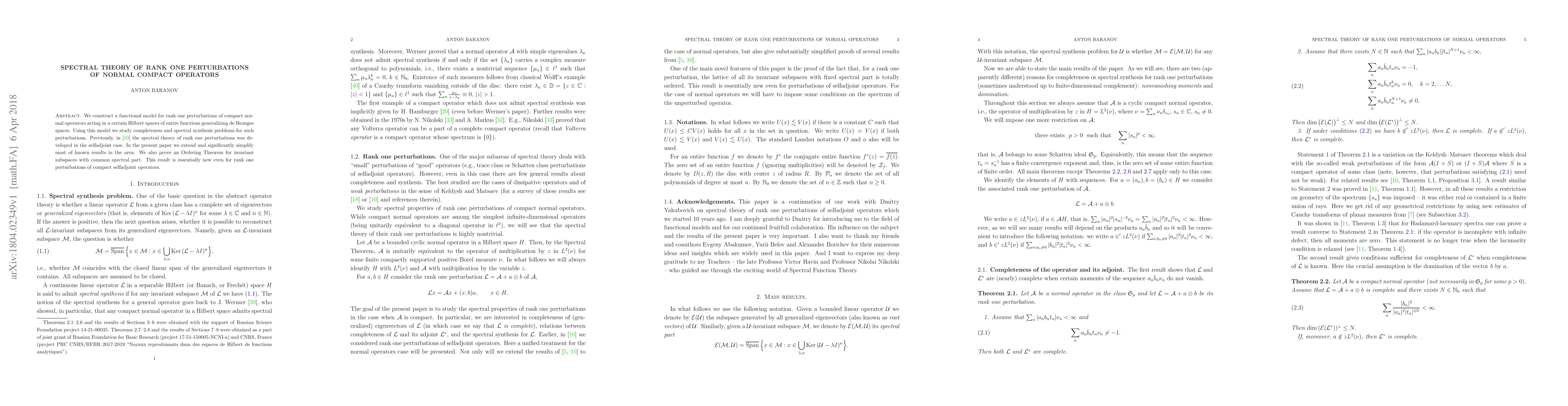 We construct a functional model for rank one perturbations of compact normal operators acting in a certain Hilbert spaces of entire functions generalizing de Branges spaces. Using this model we study completeness and spectral synthesis problems for such perturbations. Previously, we developed the spectral theory of rank one perturbations in the selfadjoint case. In the present paper we extend and significantly simplify most of known results in the area. We also prove an Ordering Theorem for invariant subspaces with common spectral part. This result is essentially new even for rank one perturbations of compact selfadjoint operators.