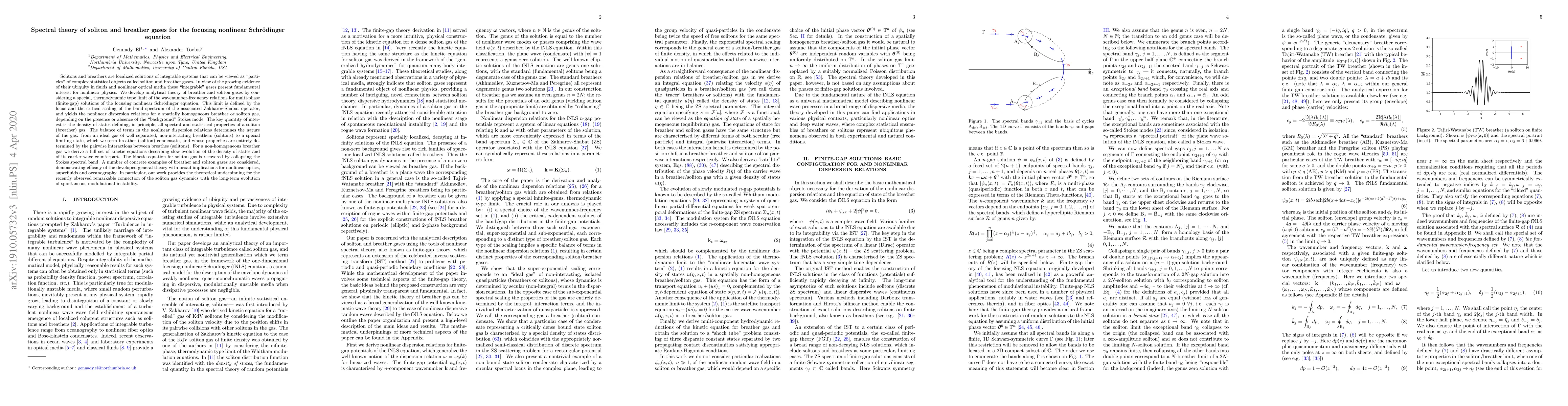 This paper develops an analytical theory for soliton and breather gases, localized solutions of integrable systems, using the focusing nonlinear Schrödinger equation. The study reveals the spectral and statistical properties of these gases, ranging from ideal gases to condensates, and provides kinetic equations for their evolution. The theory has broad implications for nonlinear optics, superfluids, and oceanography.