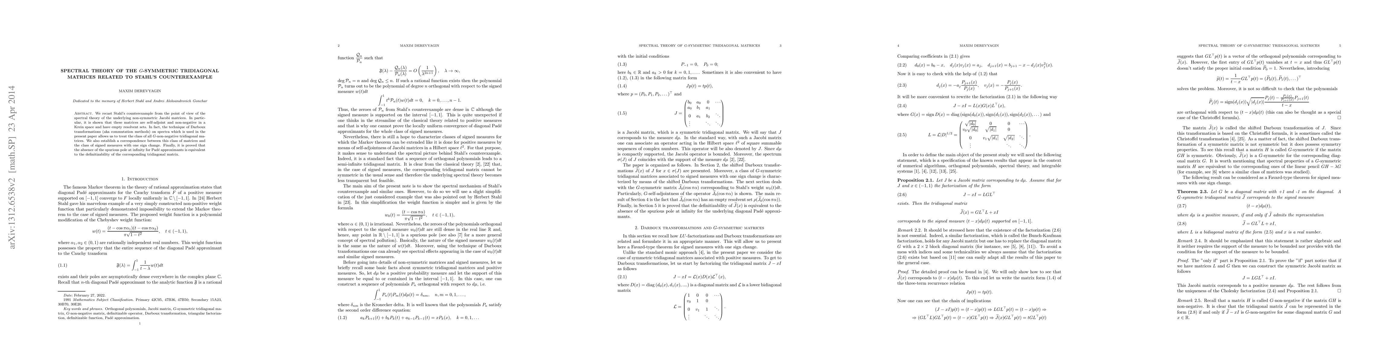 This paper explores the spectral theory of G-symmetric tridiagonal matrices linked to Stahl's counterexample, demonstrating their self-adjointness and non-negativity in a Krein space. It employs Darboux transformations to treat all G-non-negative tridiagonal matrices and establishes a correspondence with signed measures featuring one sign change, concluding that the absence of spurious poles in Padé approximants is tied to the definitizability of these matrices.